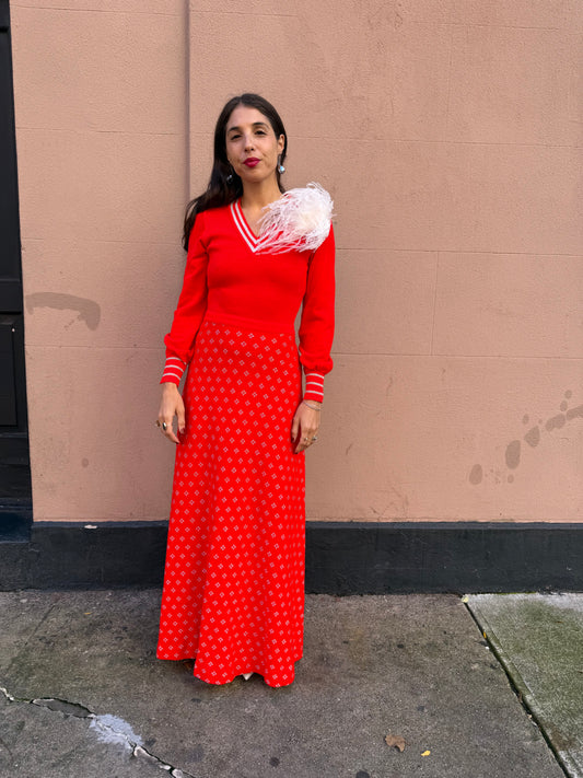 70s Red Knit Maxi Dress w silver detail