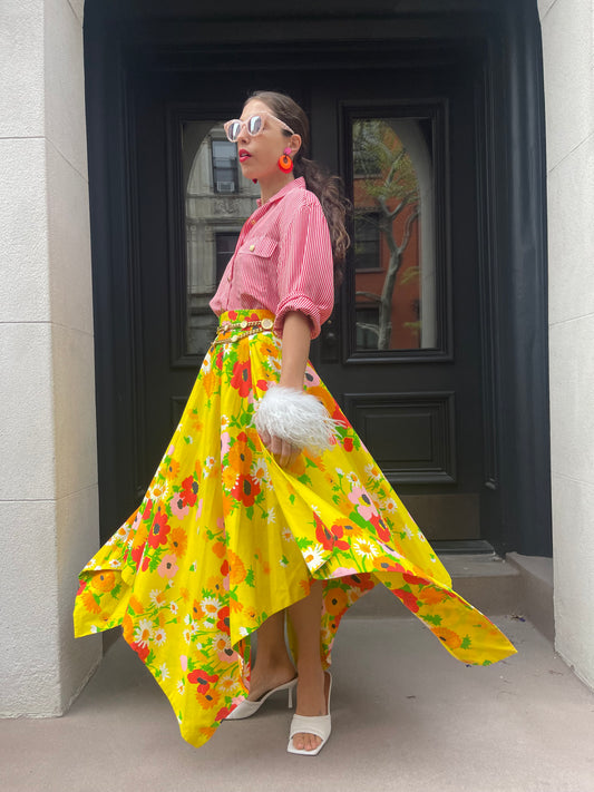60s yellow floral print wrap skirt, 28-30" waist