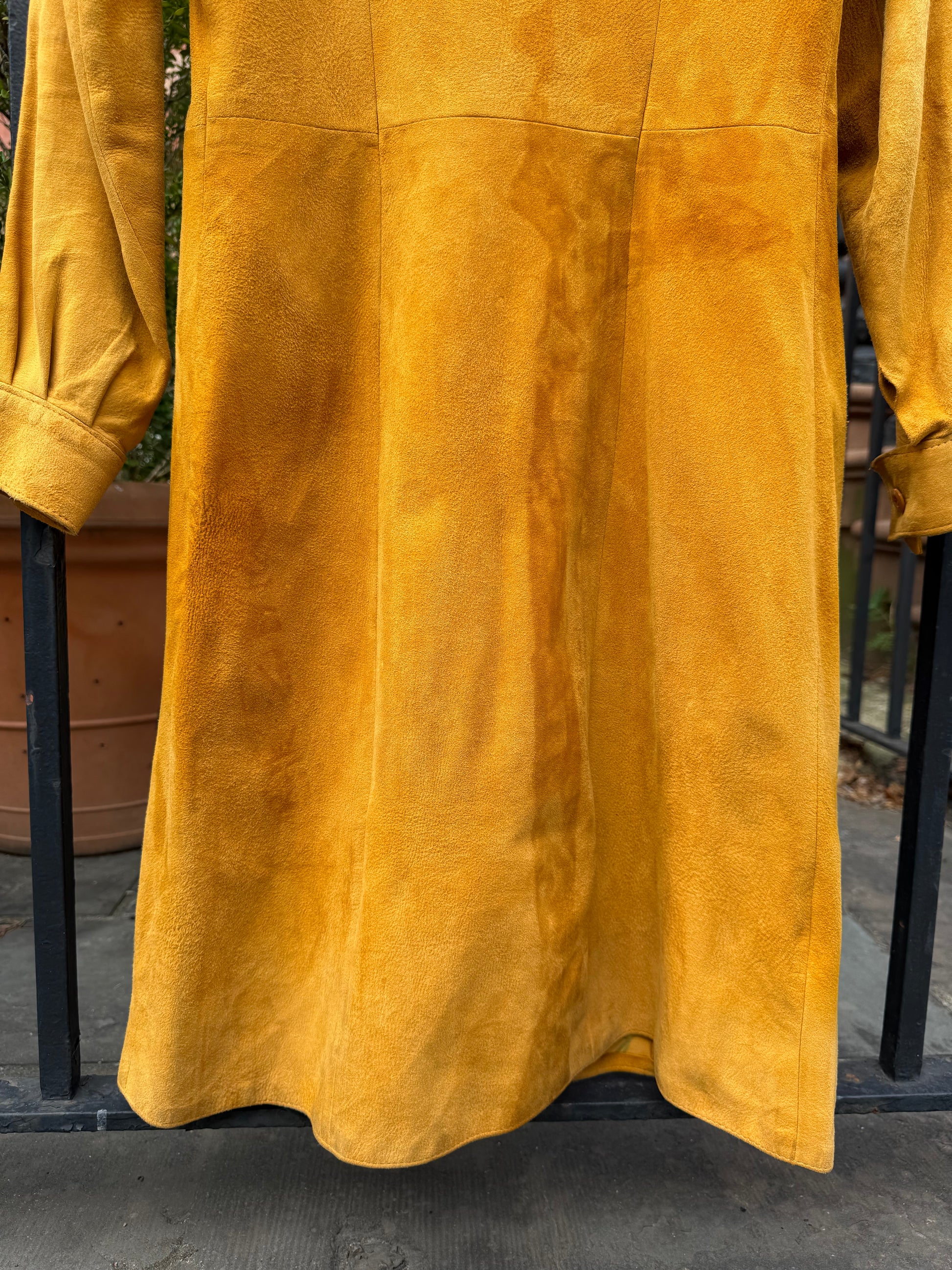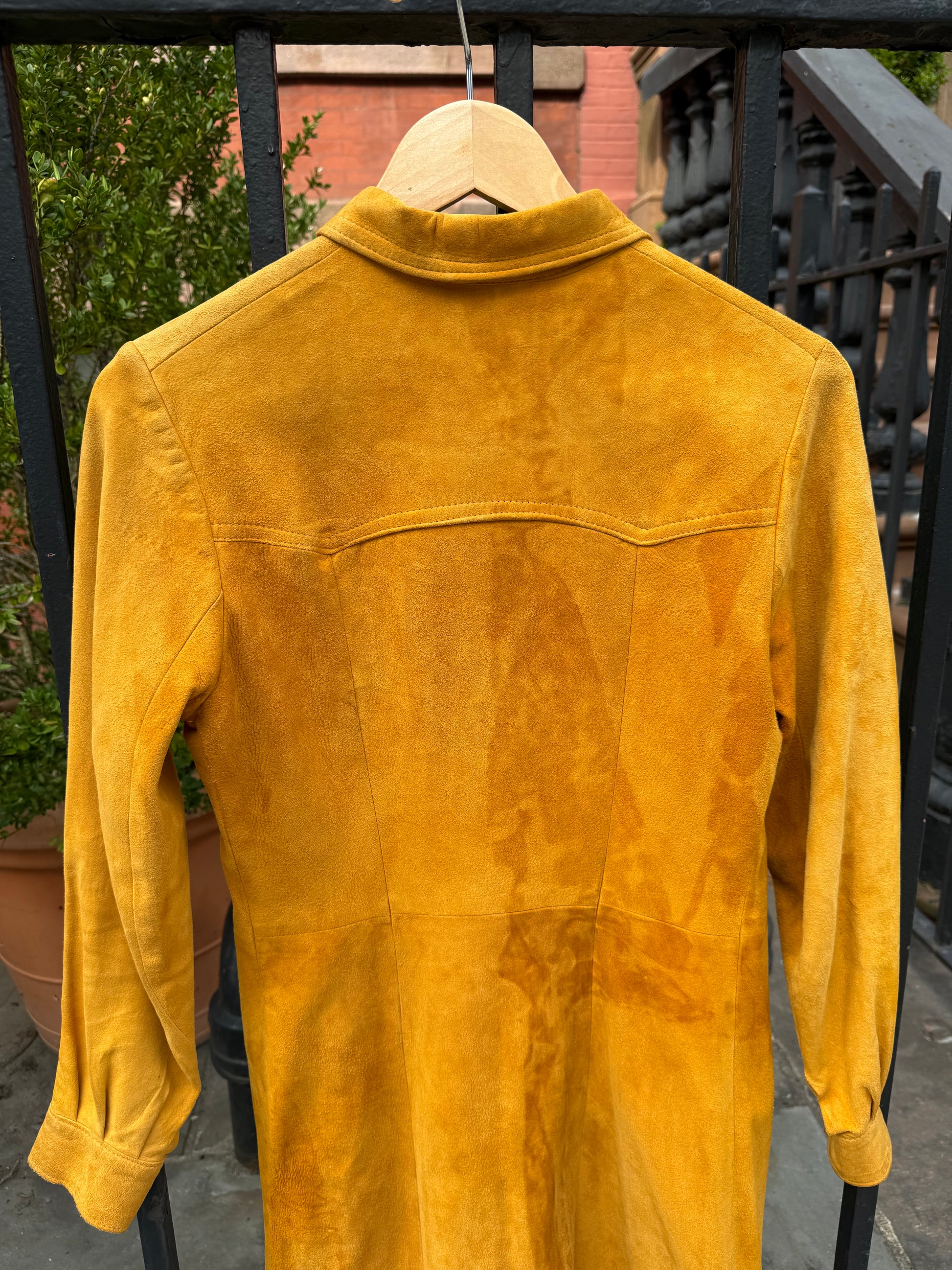 A striking vintage suede shirt dress/coat in rich mustard yellow, crafted from supple sheepskin suede with a beautifully aged patina. The design features a sharp pointed collar, button front closure, long sleeves with cuffs, and a single chest pocket—hallmarks of 1970s tailoring.