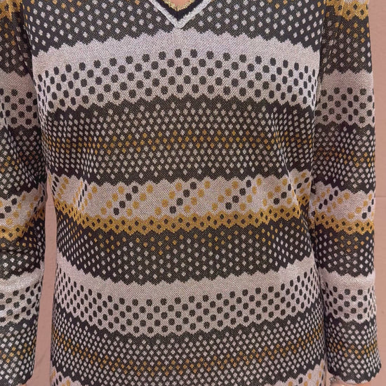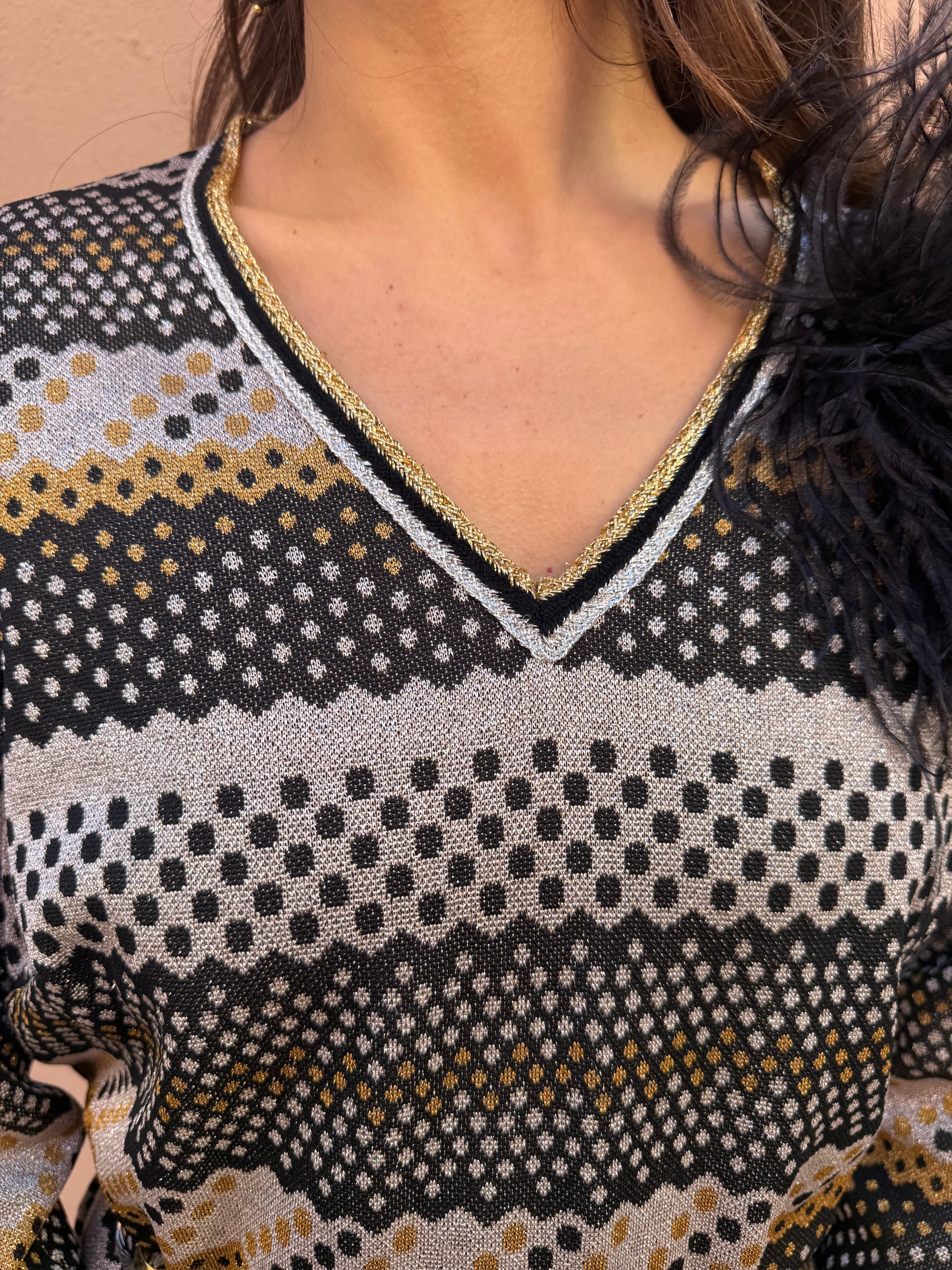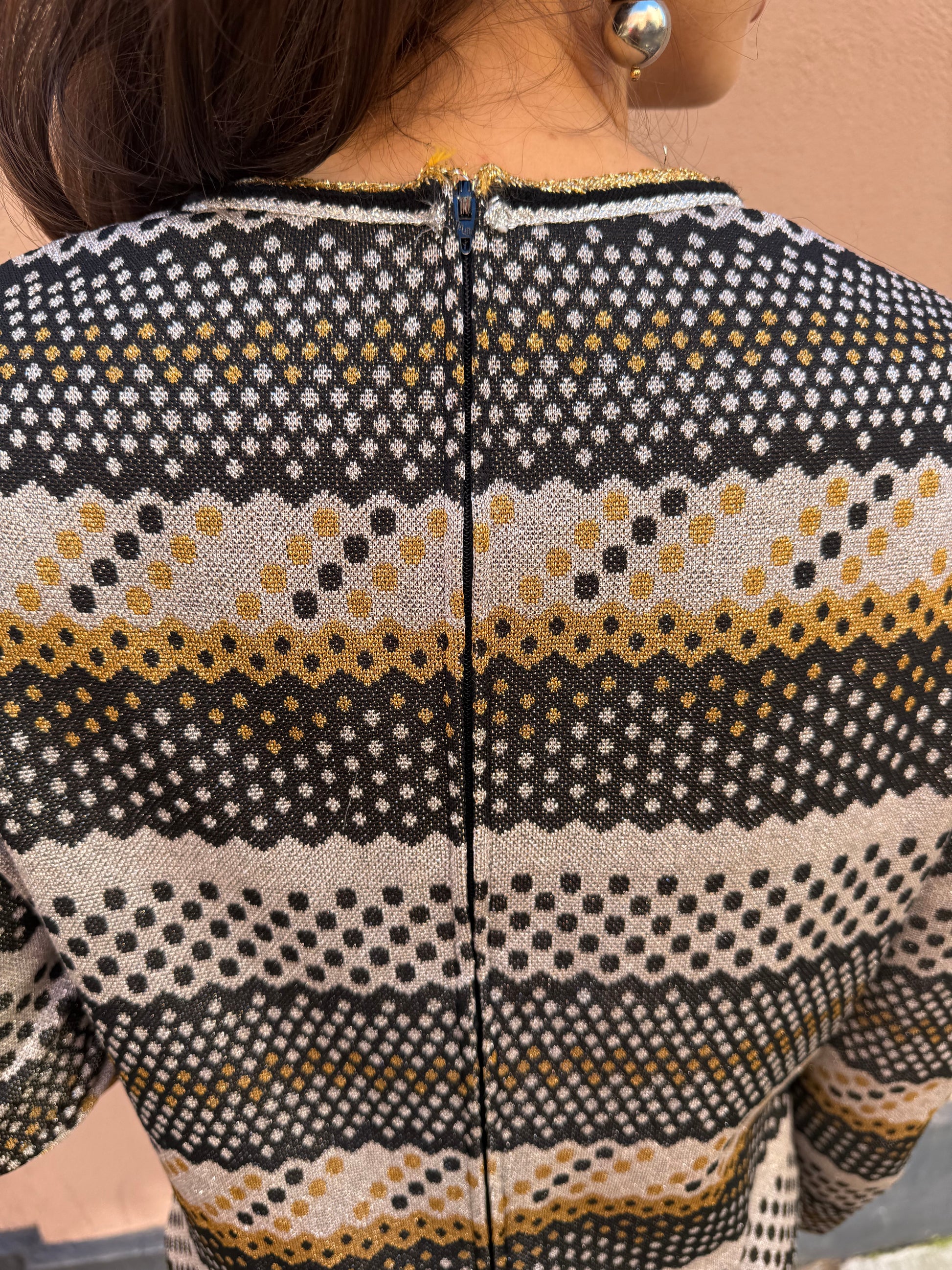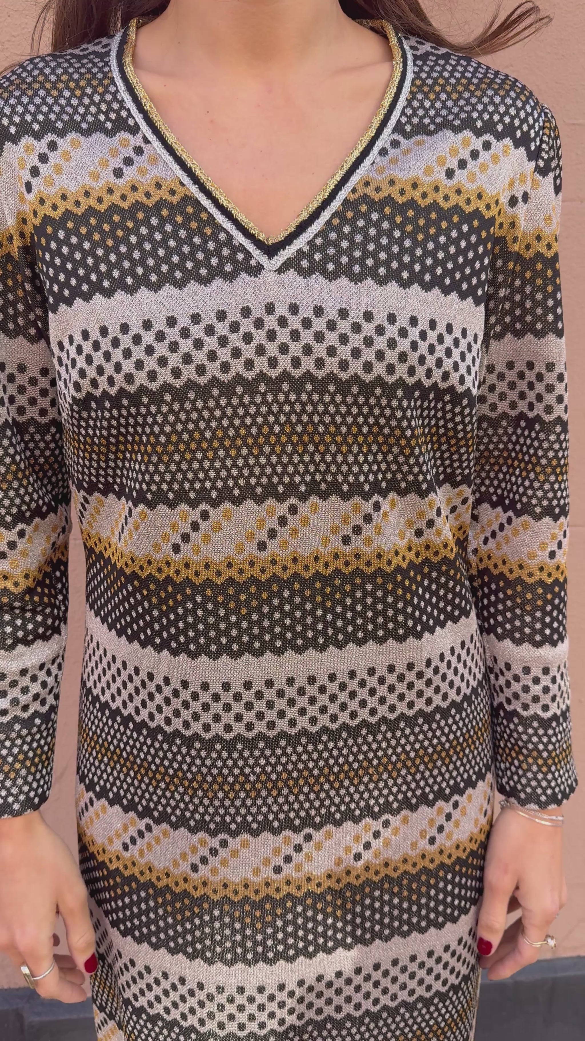 1970s long-sleeved metallic lurex dress. Featuring a mod black, silver and gold pattern, V-neckline and figure-skimming silhouette offer a flattering fit, while the textured sparkle adds instant drama.