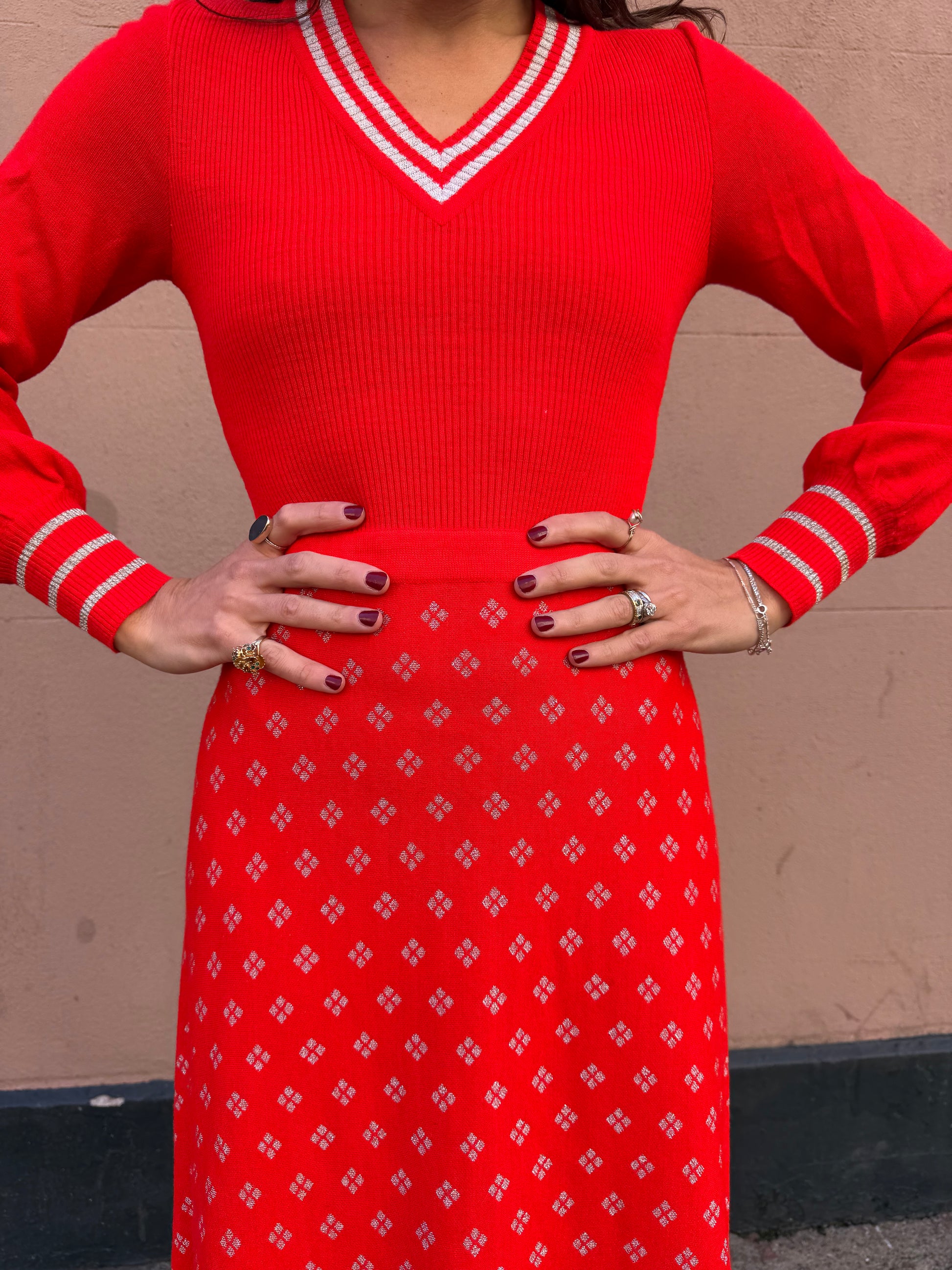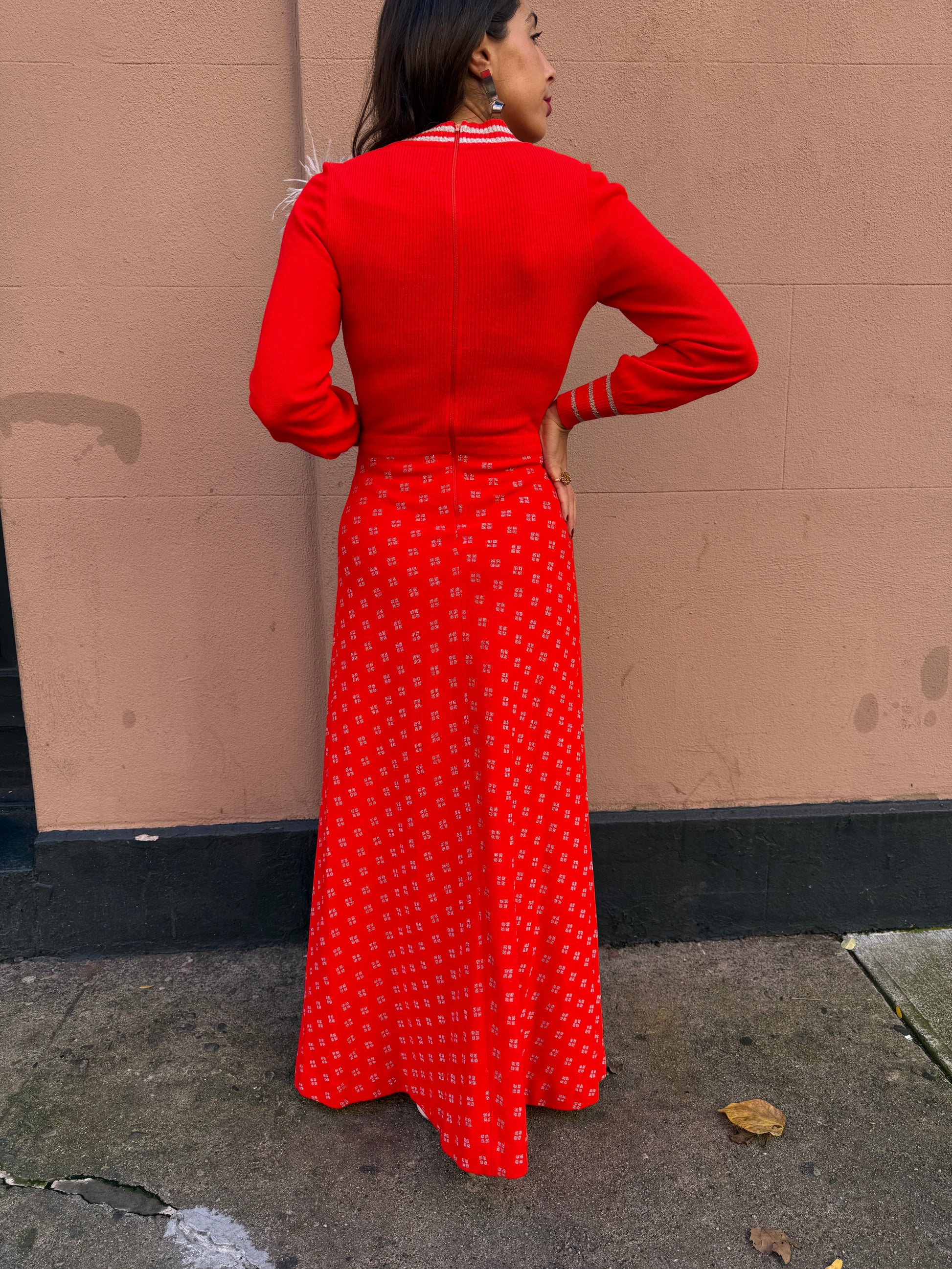 Stunning vintage red knit maxi dress, a true statement piece from the 1970s. Featuring a fitted knit bodice, striped V-neckline, and matching cuff detail, this dress blends sporty charm with elegant retro style. The flowing A-line skirt showcases a delicate geometric pattern, giving it that signature ’70s bohemian sophistication.