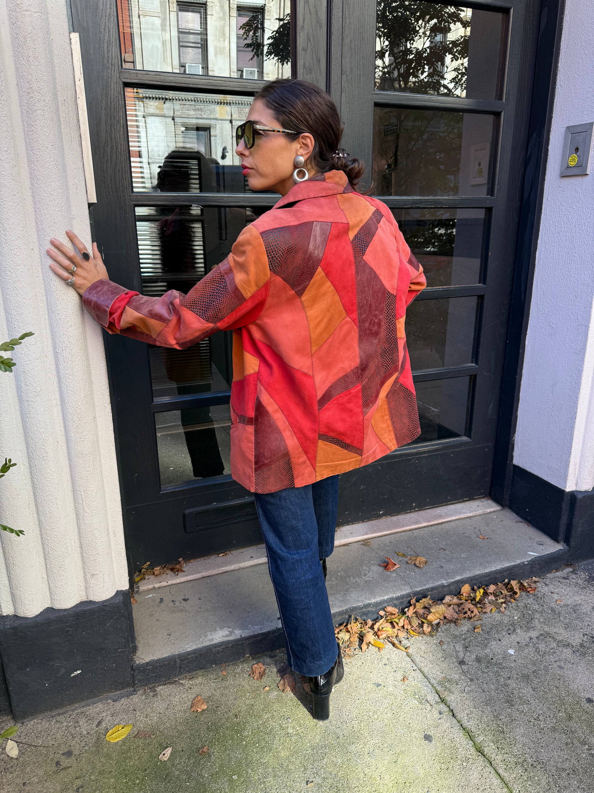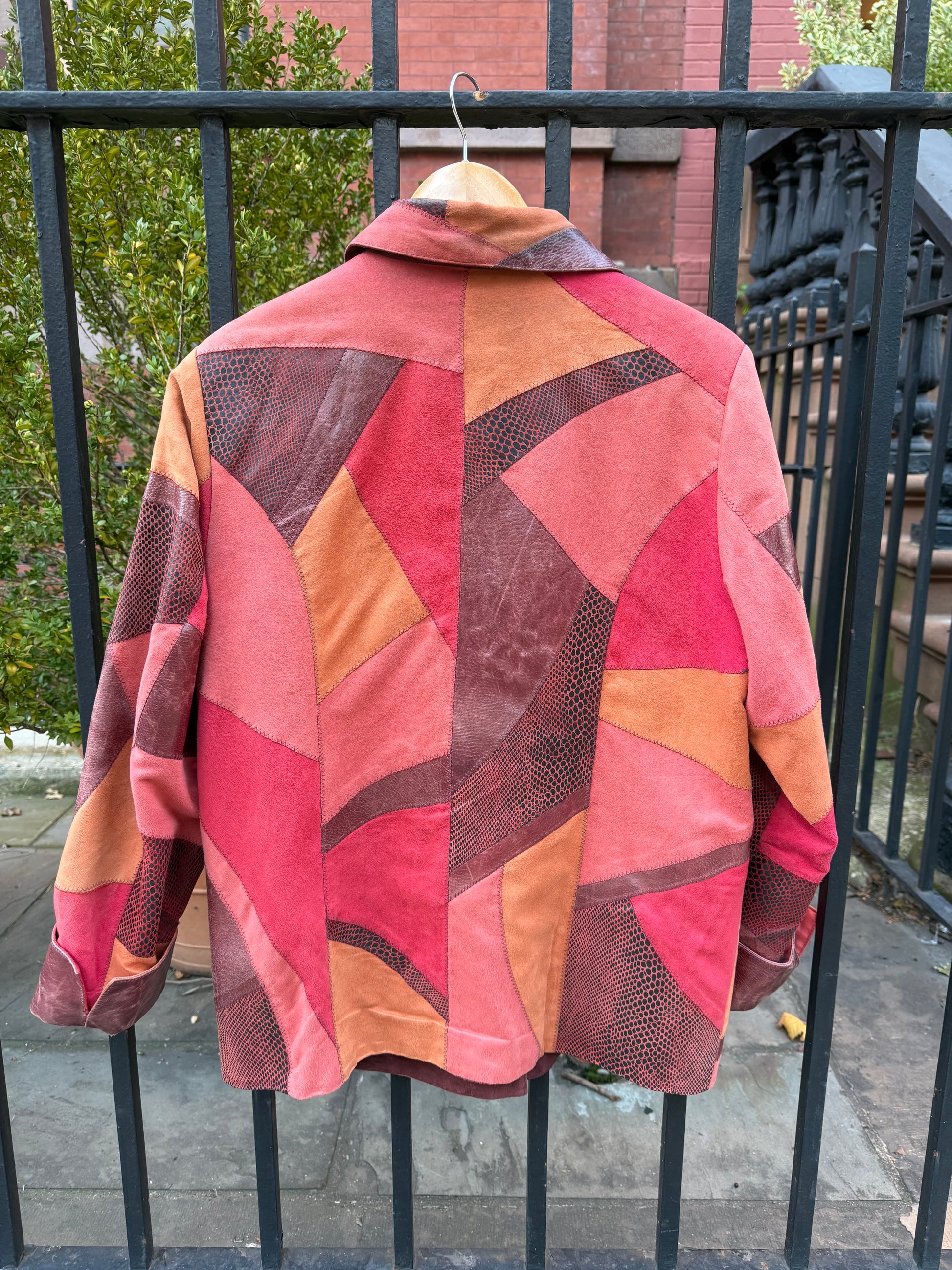 Elevate your wardrobe with this stunning 1970s vintage patchwork jacket, sourced directly from Paris, France. Crafted from a mix of leather, suede, and vegan leather, this statement piece exudes timeless Parisian chic.