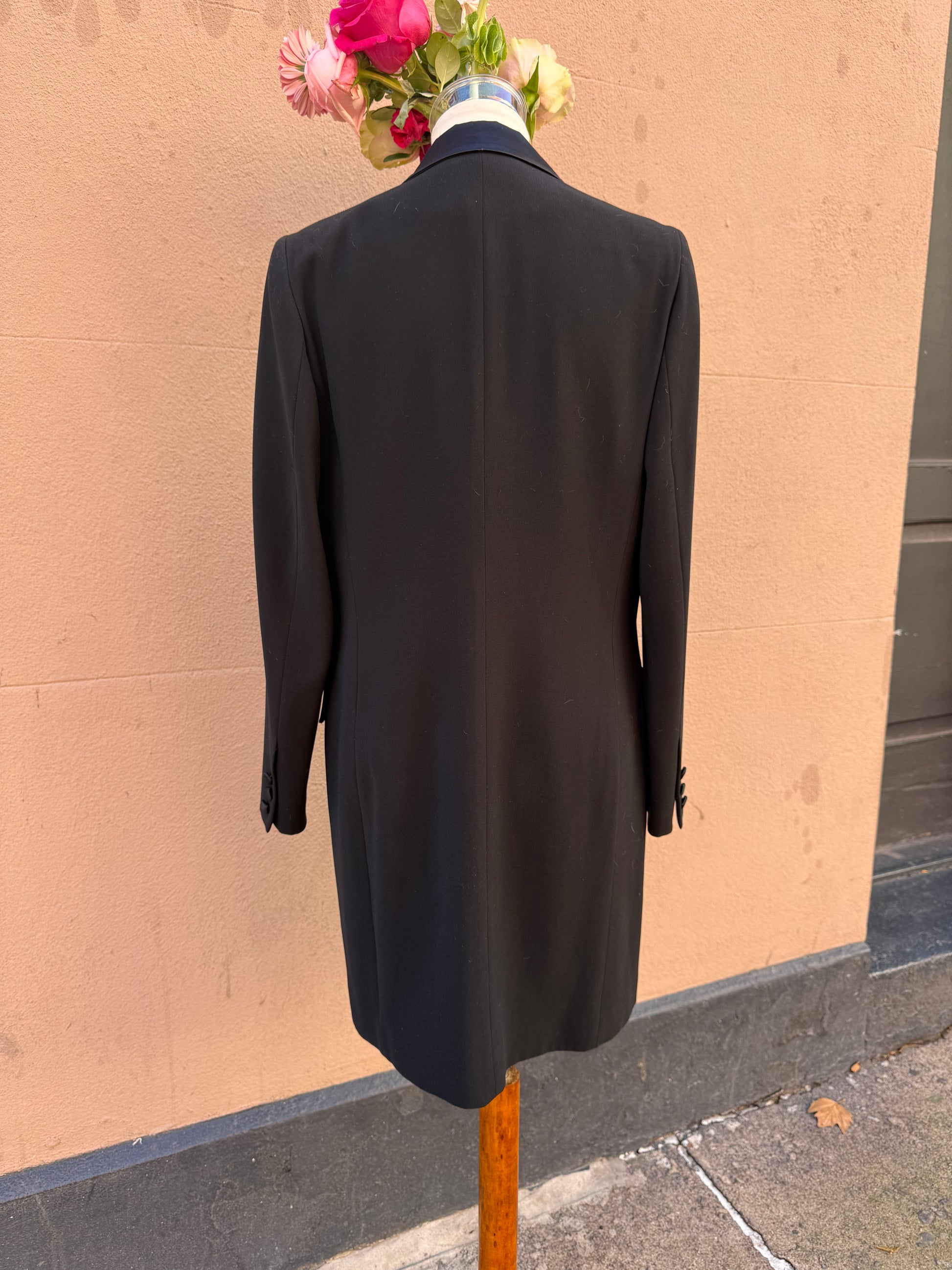 Channel timeless Parisian sophistication with this vintage 1990s French tuxedo jacket. Designed with clean lines and a long, minimalist silhouette, this jacket features smooth satin-trimmed flap pockets, a single button closure, and a deep V-front that creates a flattering, elongated shape.