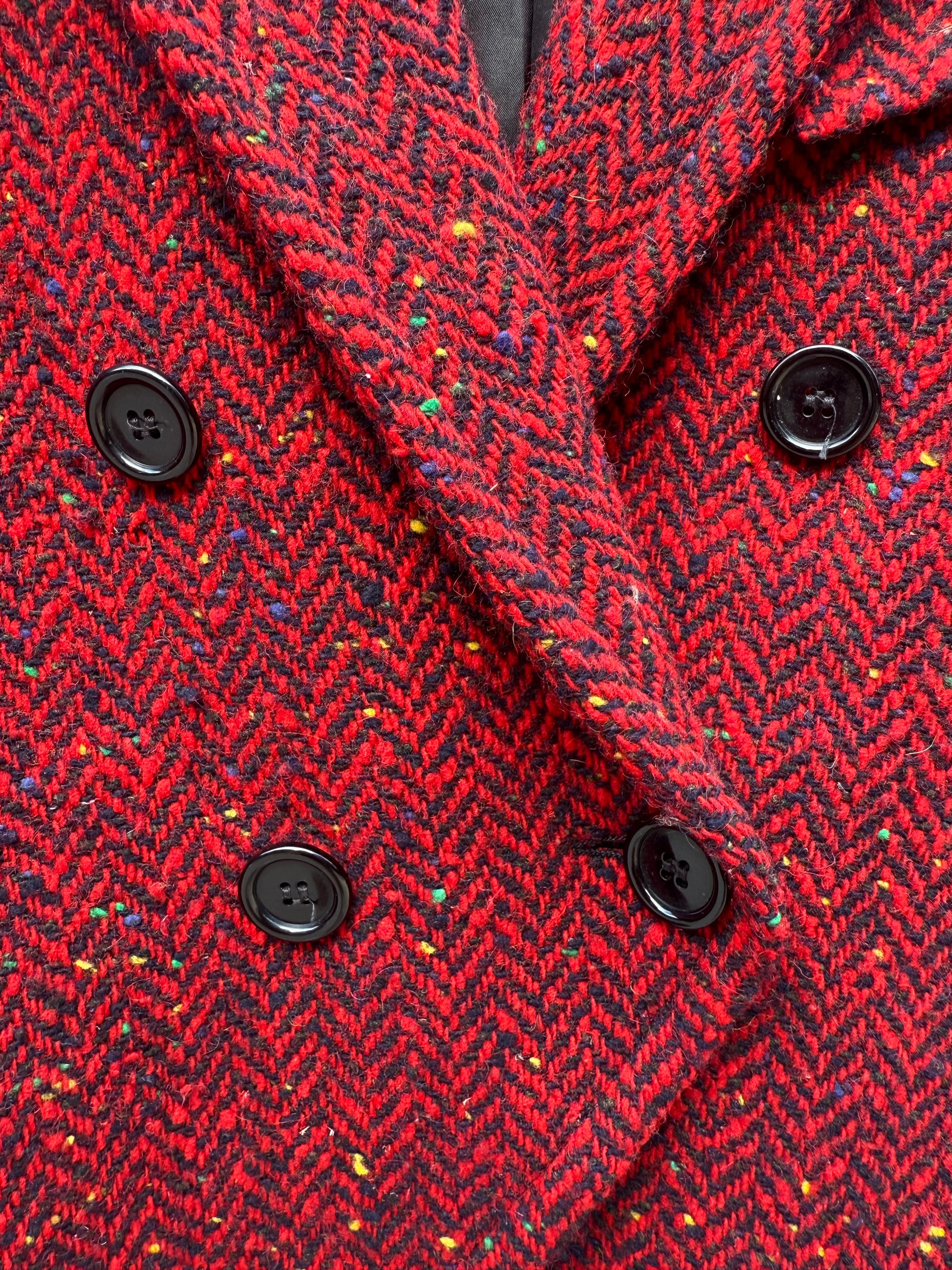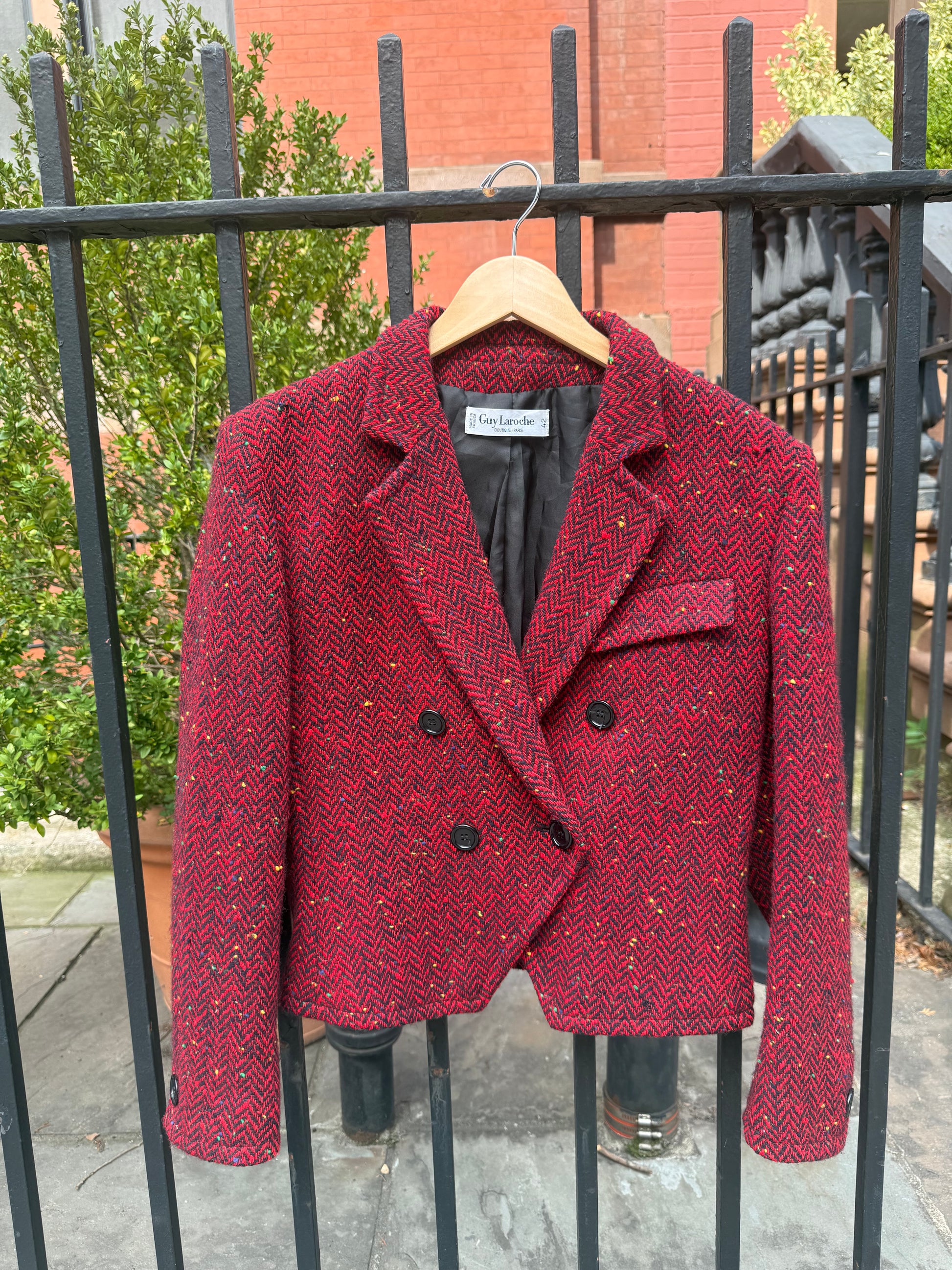 A rare vintage Guy Laroche cropped blazer in a bold red and black herringbone tweed, accented with subtle flecks of yellow and green for added depth. This piece captures the maison’s refined tailoring with a playful twist.