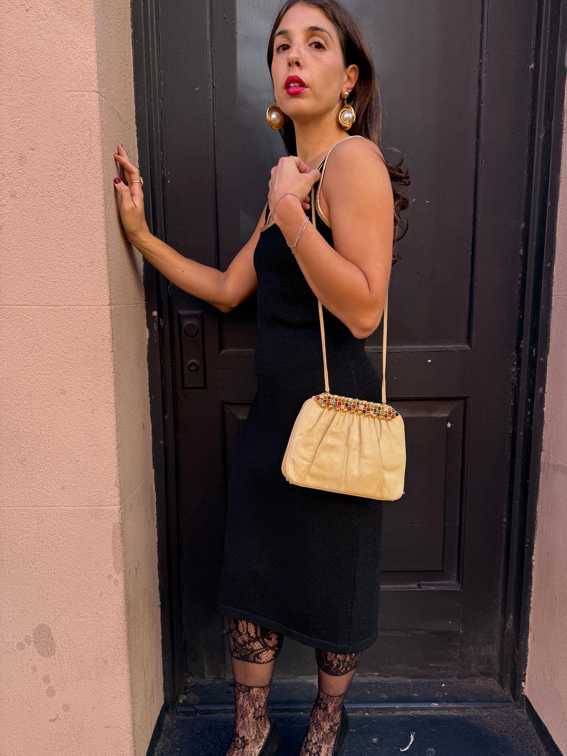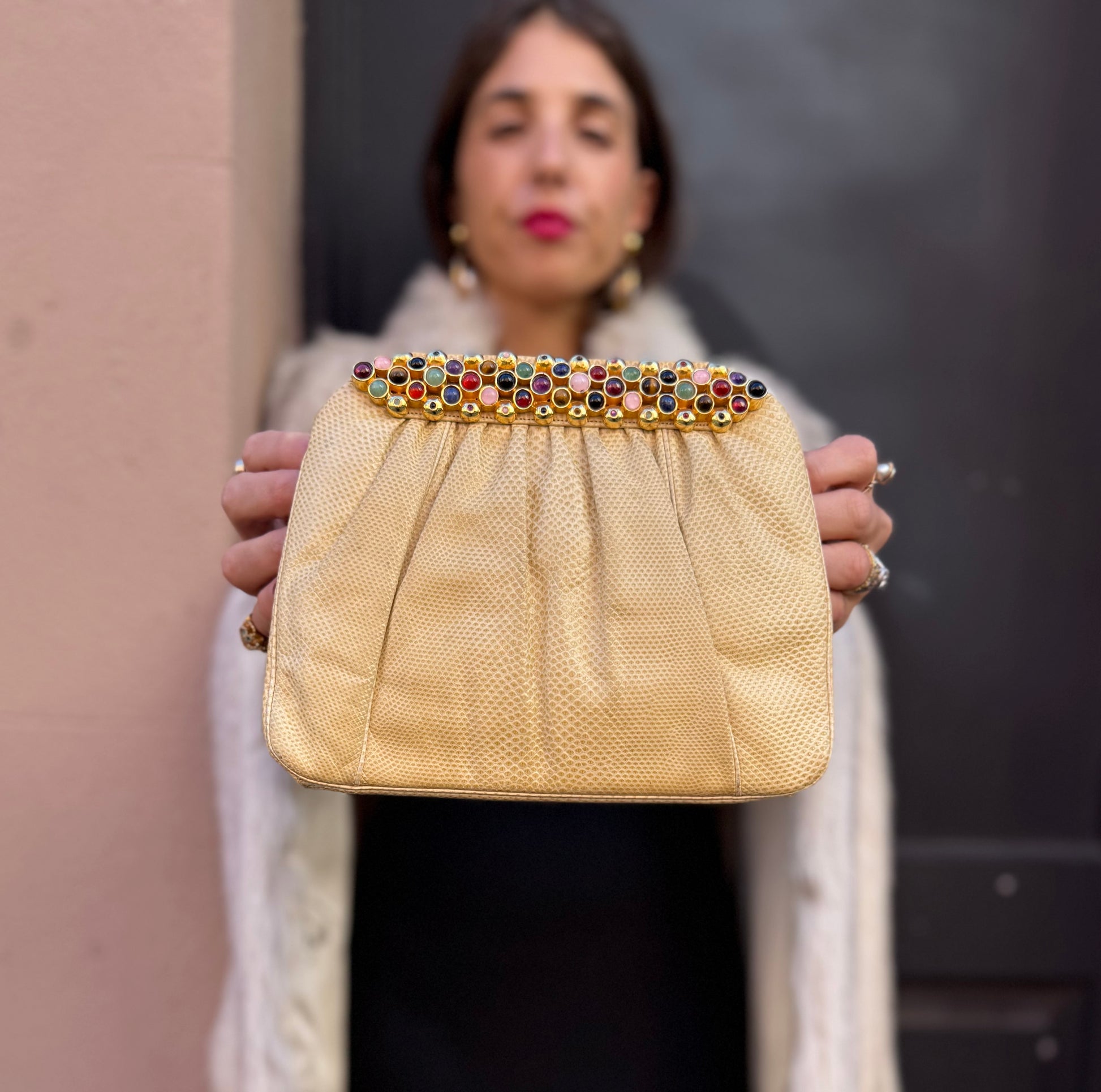 Opulence meets exotic glamour! Judith Leiber lizard handbag, crafted in a soft beige-gold tone with a structured, pleated silhouette. The top clasp is adorned with multicolored cabouchons set in gold-toned trim. One for the collection!!