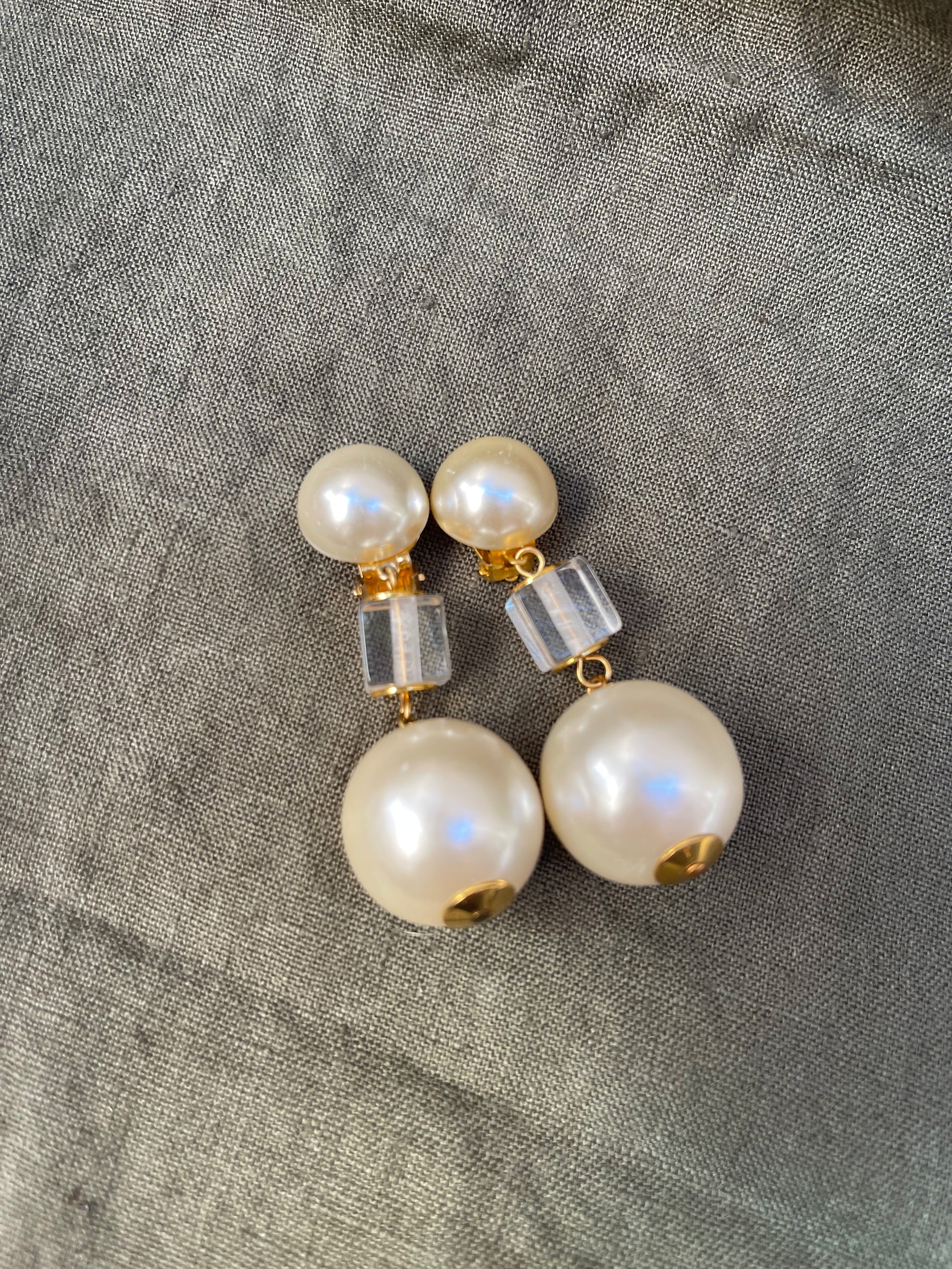 These vintage pearl and crystal earrings, feature a stunning tiered drop design that blends old-world charm with modern elegance. Each earring showcases a delicate faux pearlbead, accented by gold-tone connectors and two clear rectangular crystal beads, culminating in a larger faux pearl drop that adds graceful movement and shimmer.
