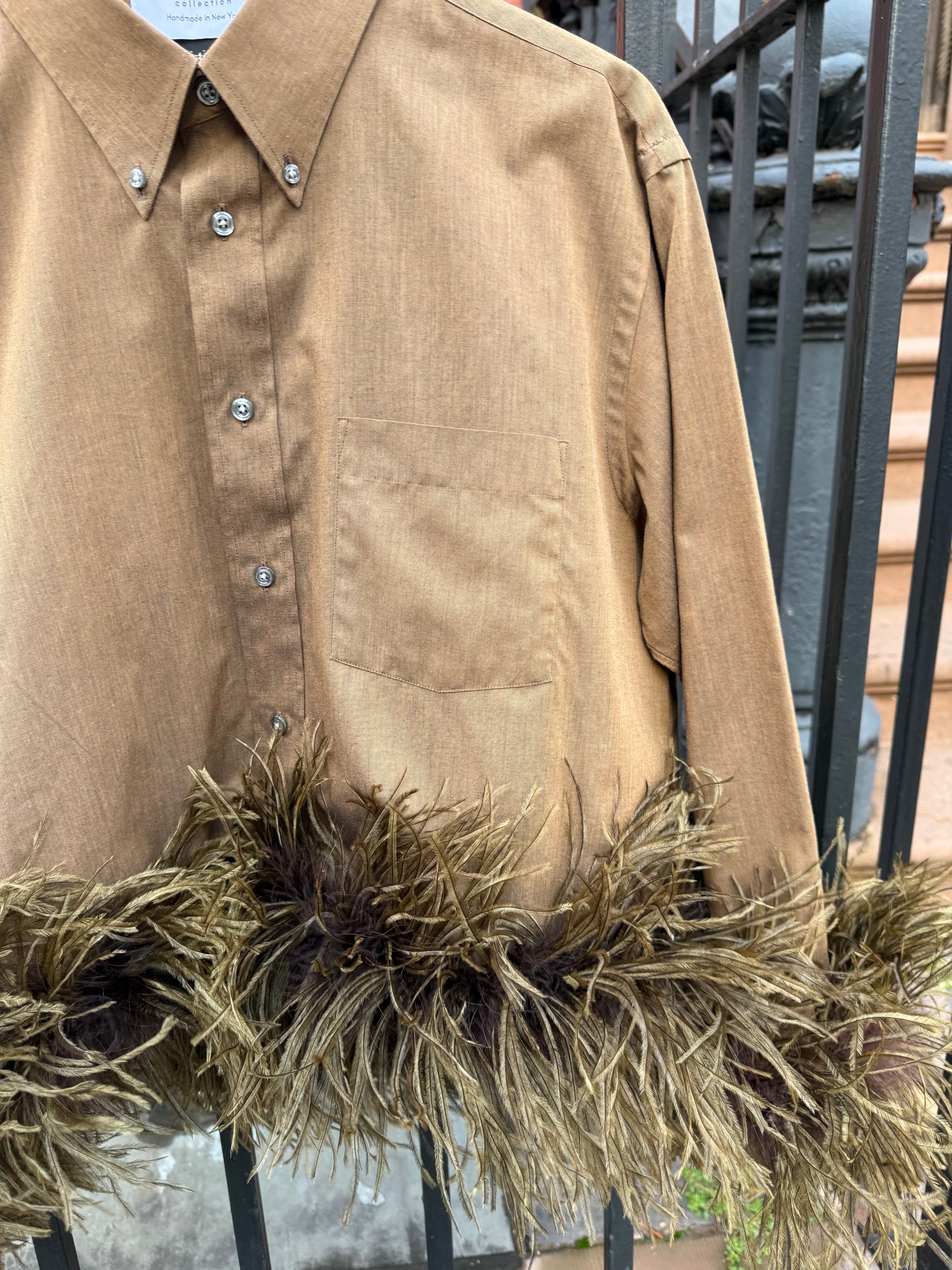 The Colette is our take on fanciful style. We start by up-cycling men's shirts & add our signature detachable ostrich feathers to the cuffs and bottom hem. All pieces are sewn by hand in our NYC atelier using only the highest quality, and ethically sourced feathers.