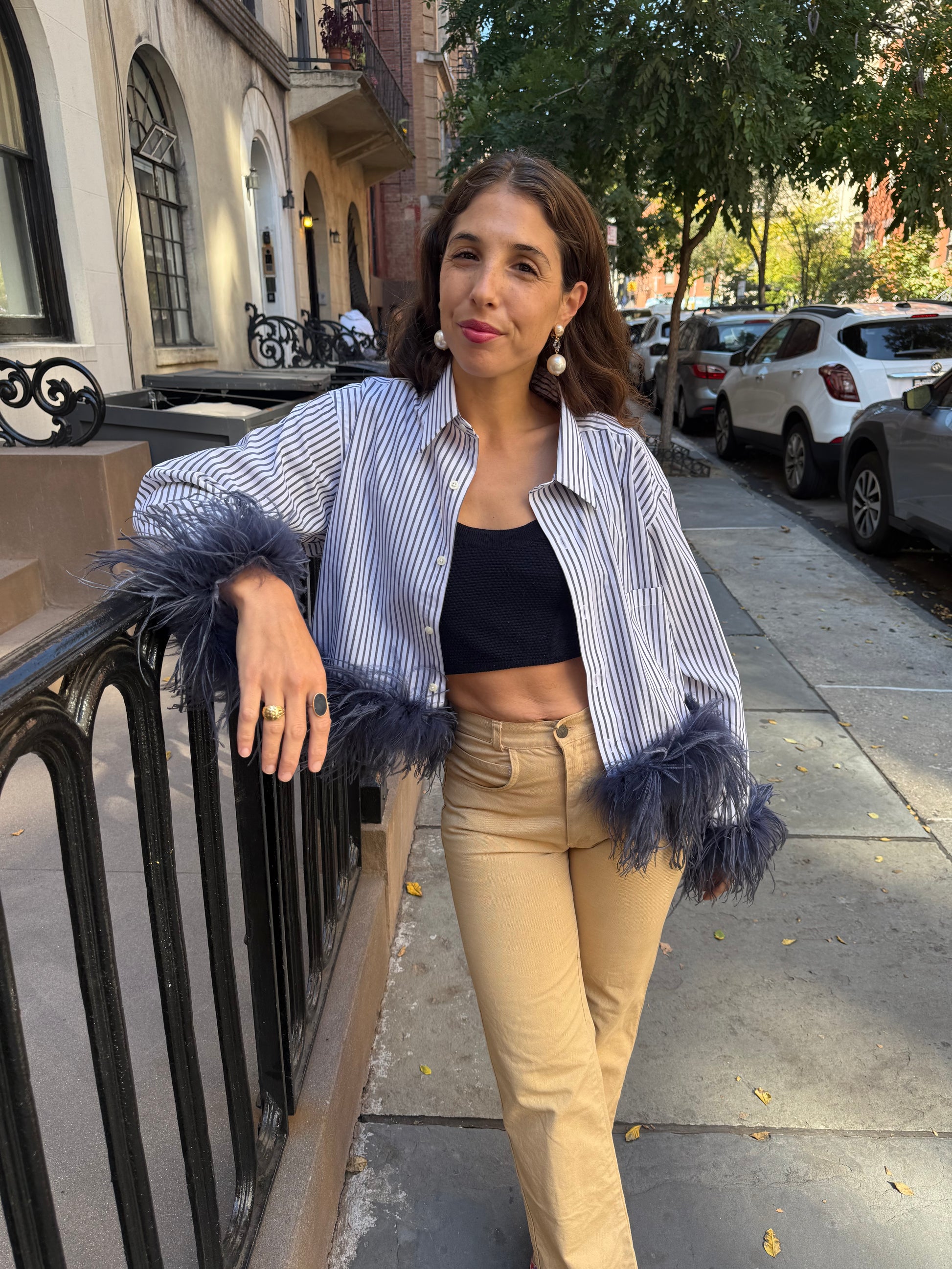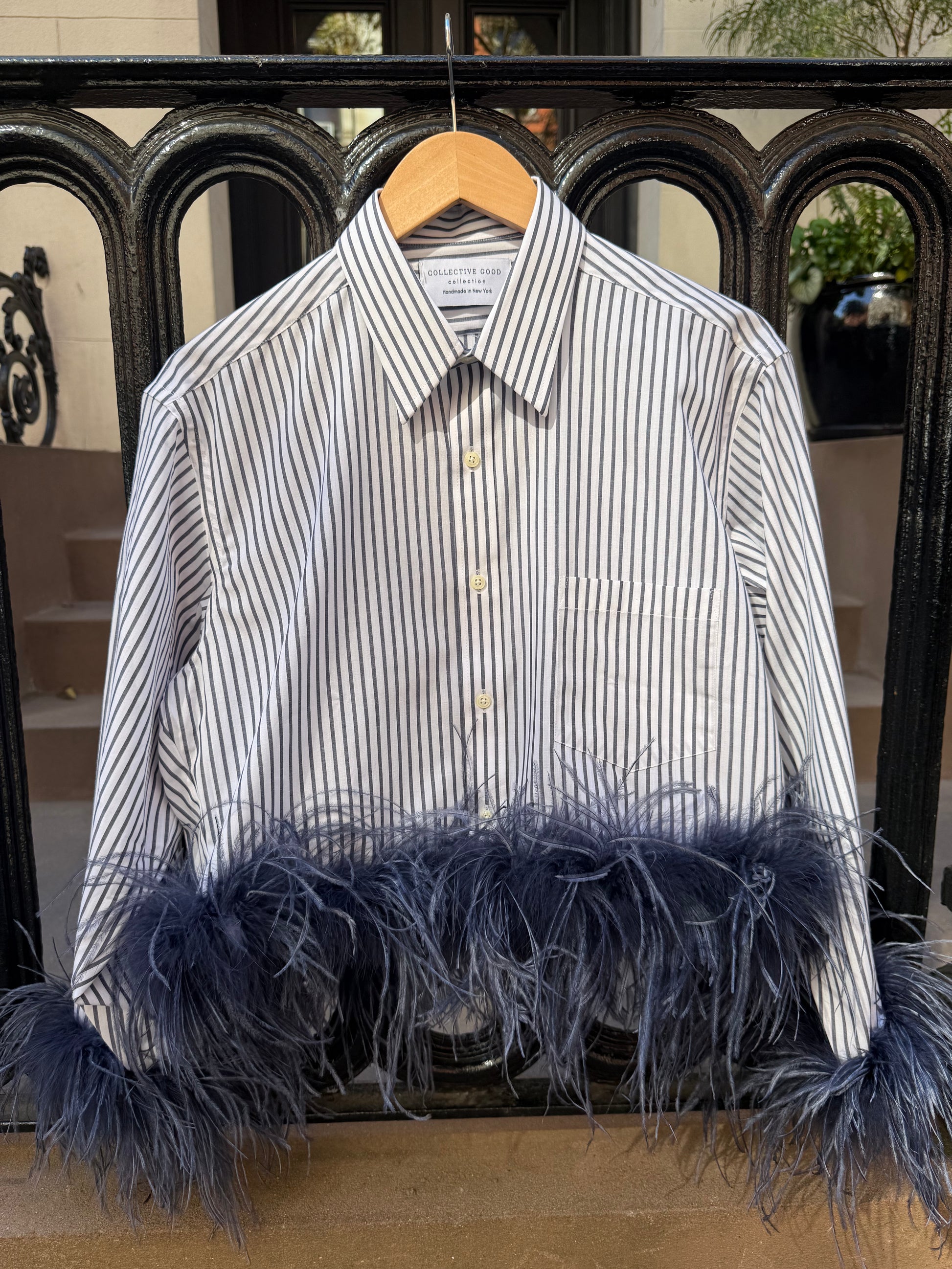 The Colette is our take on fanciful style. We start by up-cycling men's shirts & add our signature detachable ostrich feathers to the cuffs and bottom hem. All pieces are sewn by hand in our NYC atelier using only the highest quality, and ethically sourced feathers.