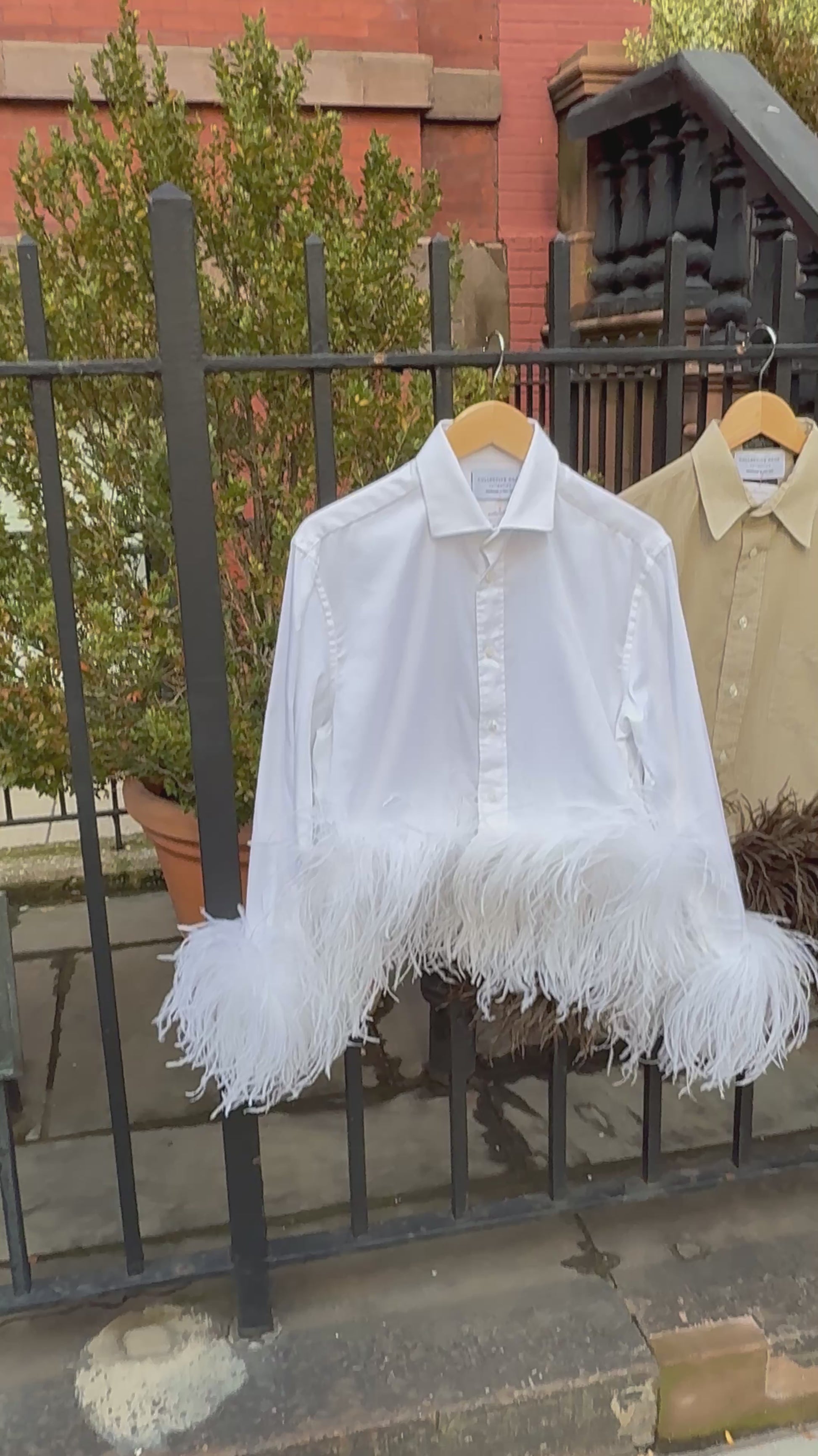 The Colette is our take on fanciful style. We start by up-cycling men's shirts & add our signature detachable ostrich feathers to the cuffs and bottom hem. All pieces are sewn by hand in our NYC atelier using only the highest quality, and ethically sourced feathers.