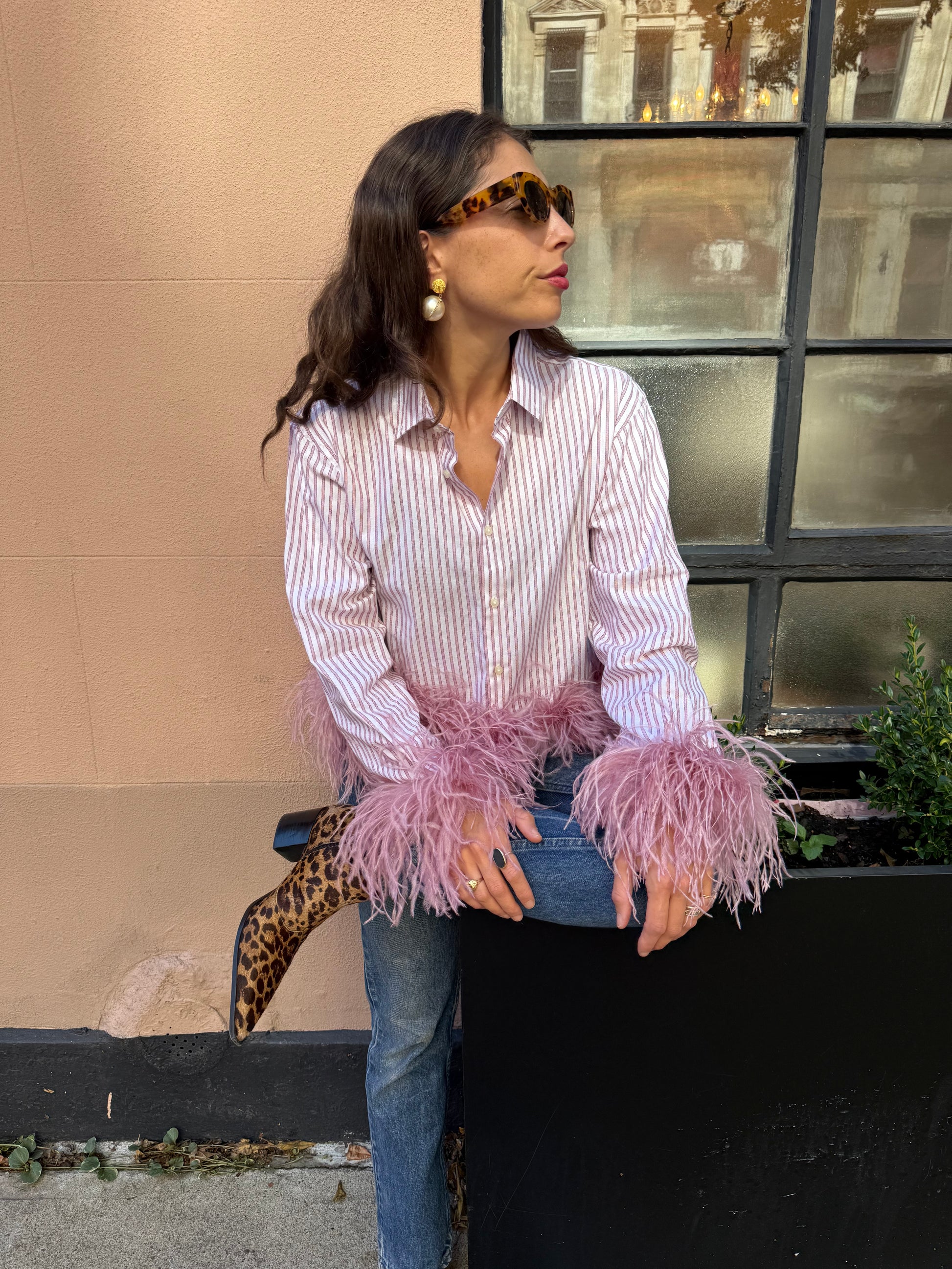 The Colette is our take on fanciful style. We start by up-cycling men's shirts & add our signature detachable ostrich feathers to the cuffs and bottom hem. All pieces are sewn by hand in our NYC atelier using only the highest quality, and ethically sourced feathers.