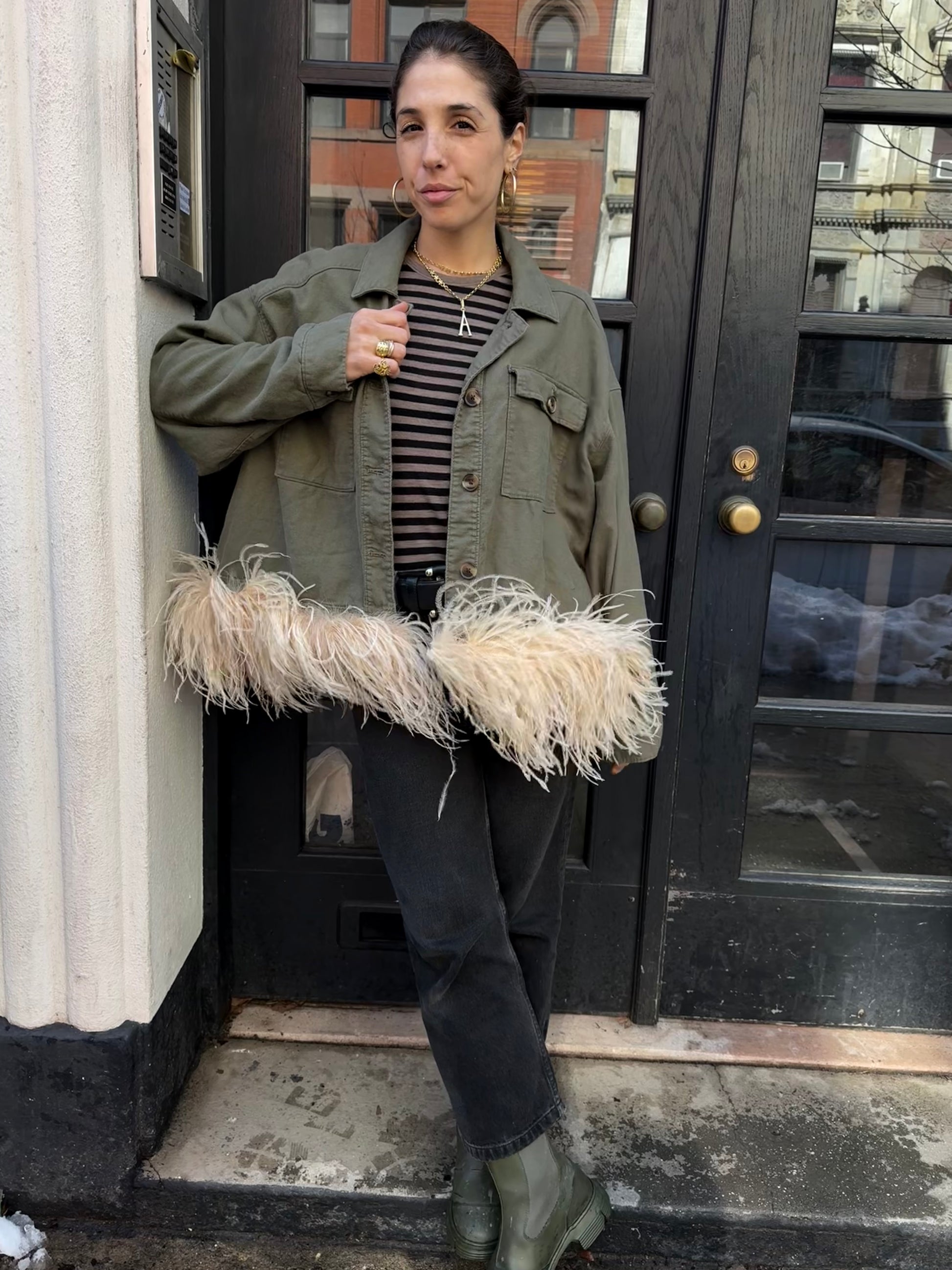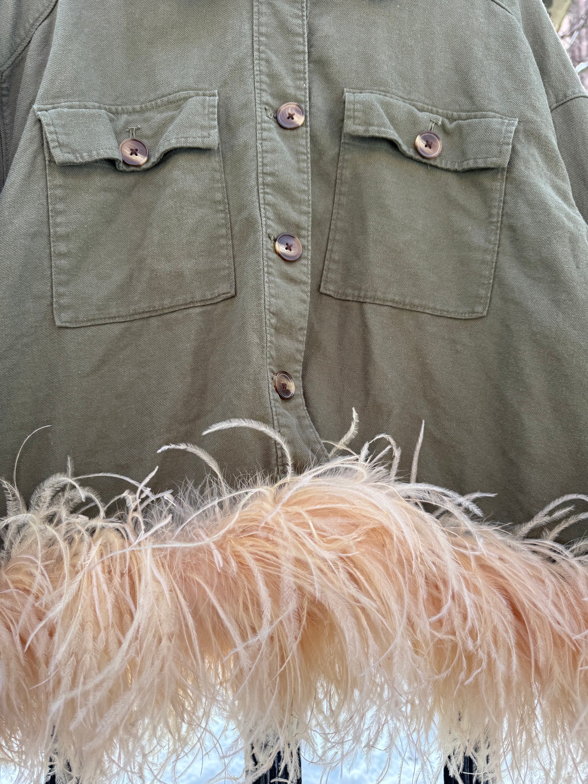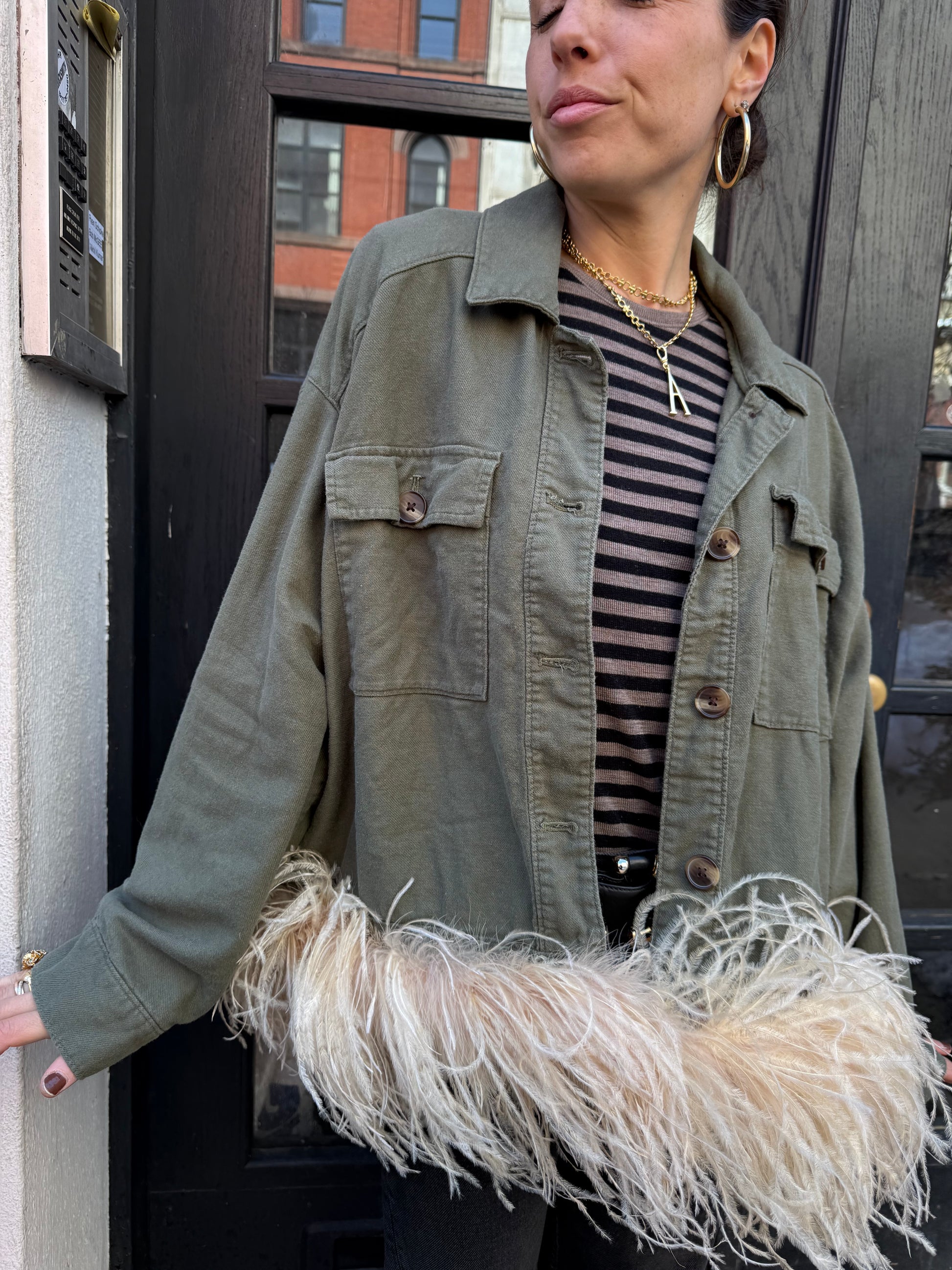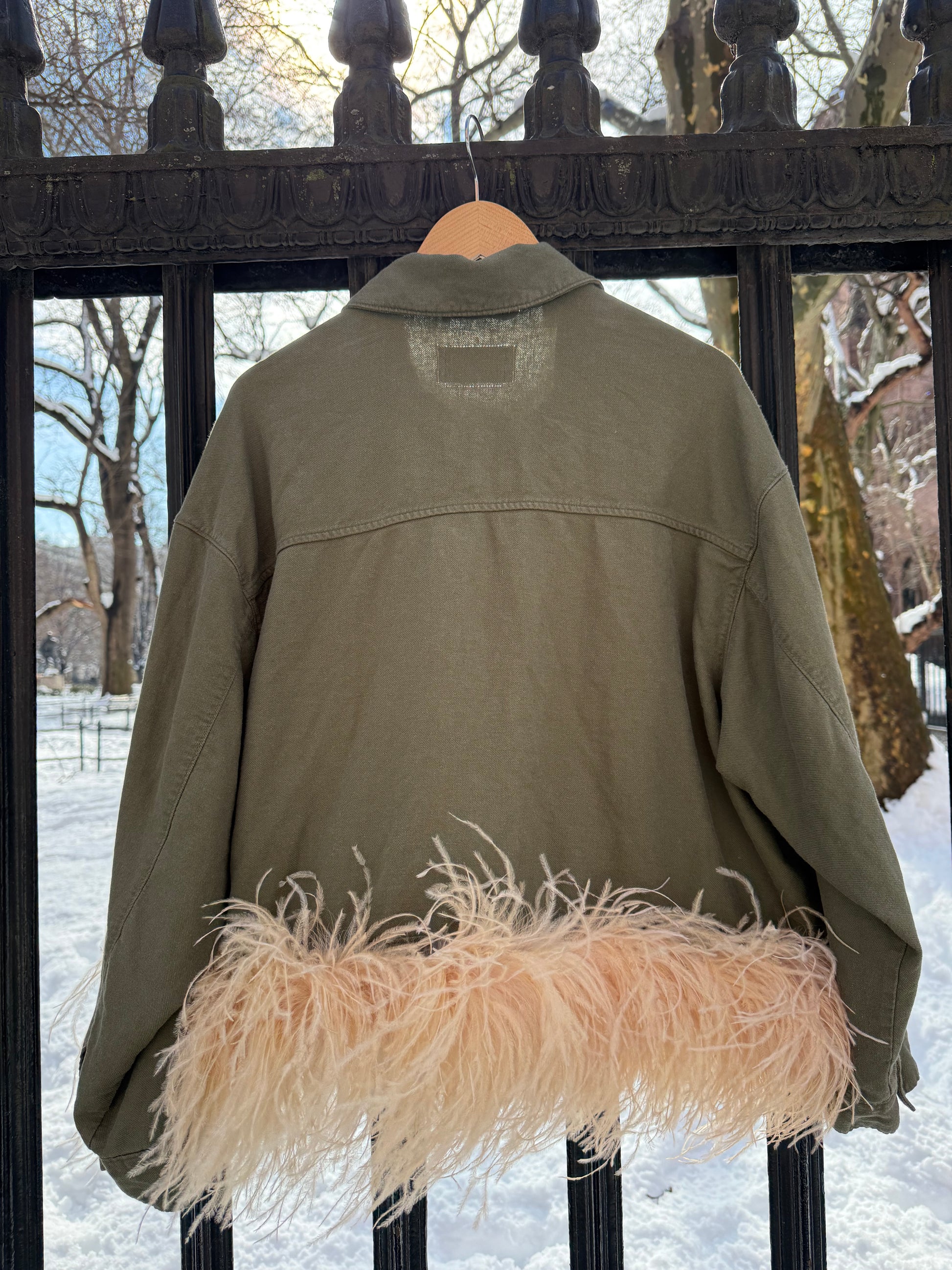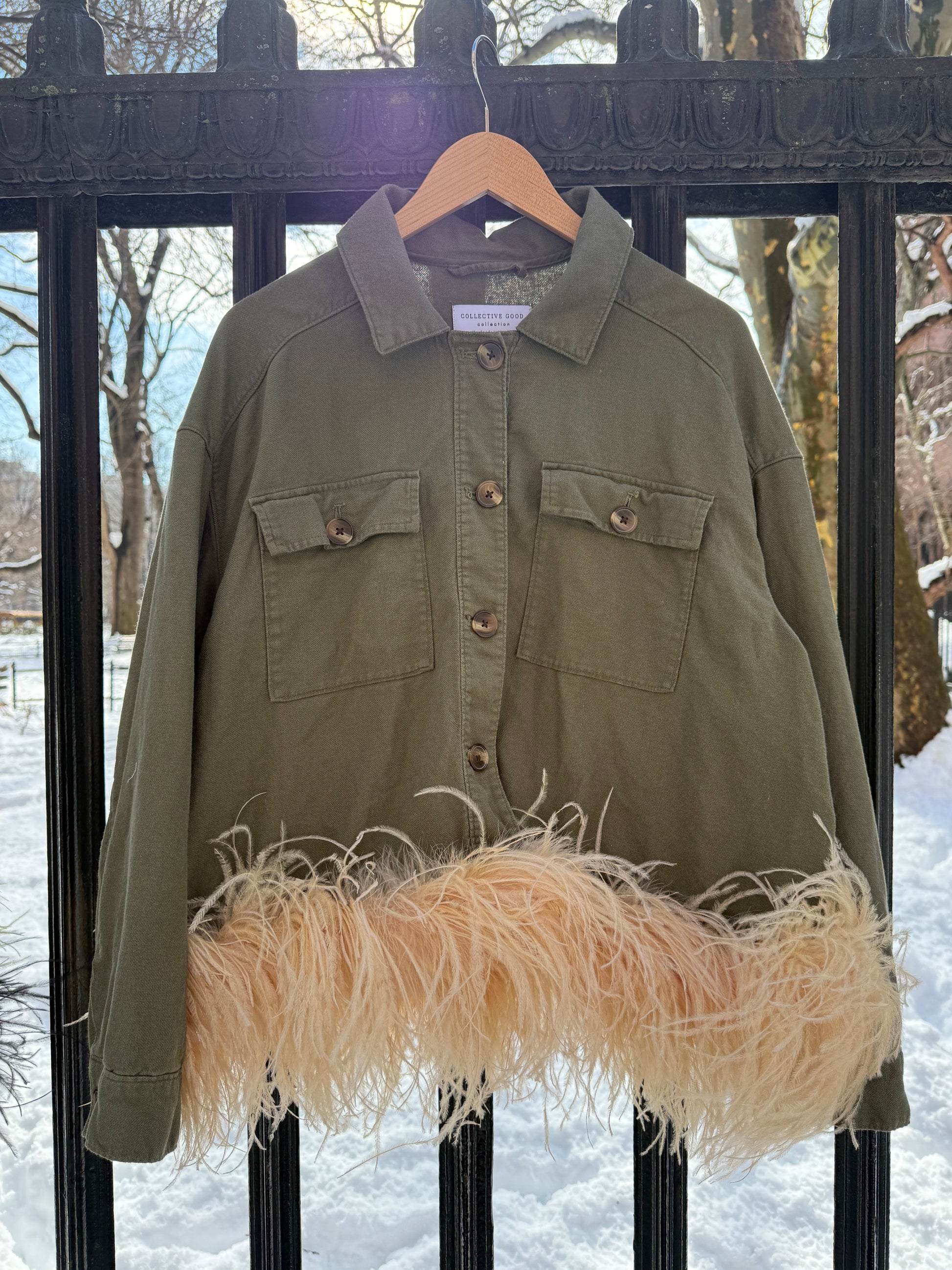 The Jac is our take on feminine-utility style. We start by up-cycling a utilitarian style jacket & add our signature detachable ostrich feathers to the bottom hem. All pieces are sewn by hand in our NYC atelier using only the highest quality, and ethically sourced feathers.