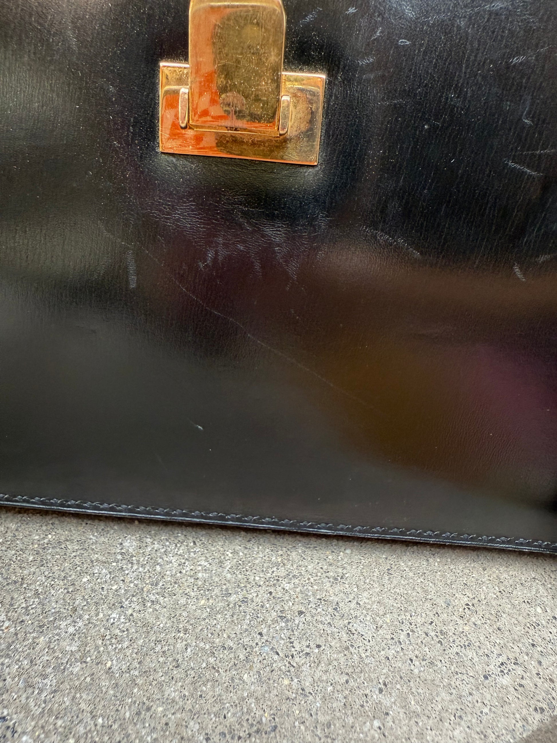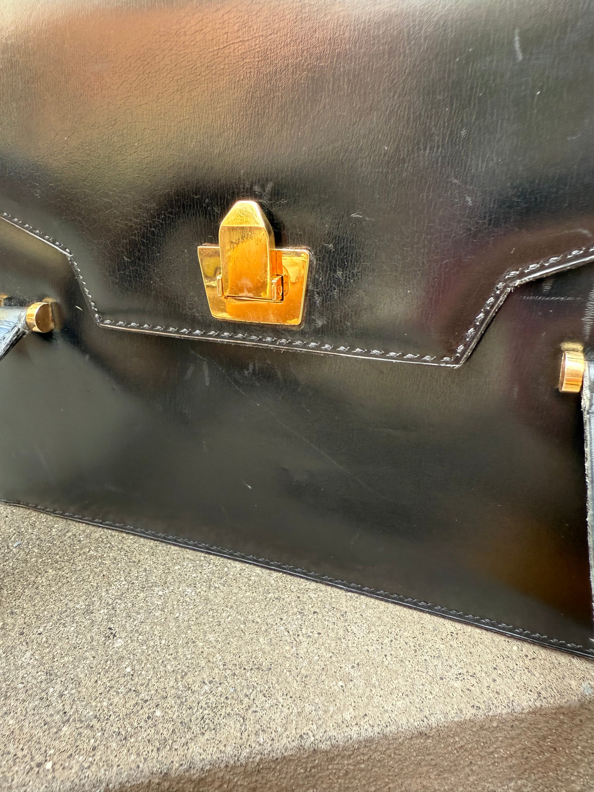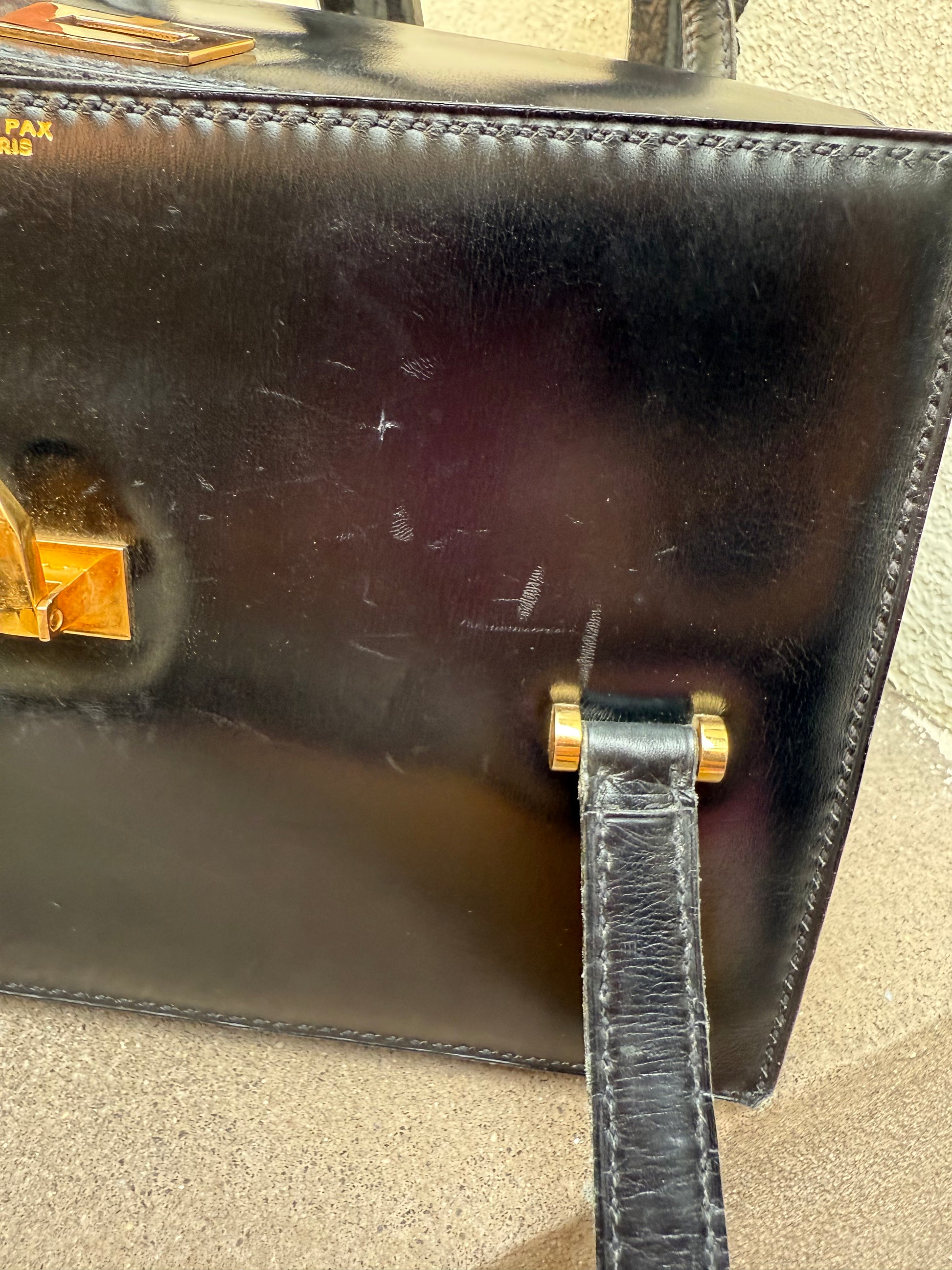 This is a vintage Jean Pax Paris handbag in black leather with gold-tone hardware. The design is structured and elegant, very much in line with mid-century French luxury leather goods. Jean Pax isn’t as widely known today as brands like Hermès or Moynat, but in its time, it catered to the Parisian luxury market with refined craftsmanship.