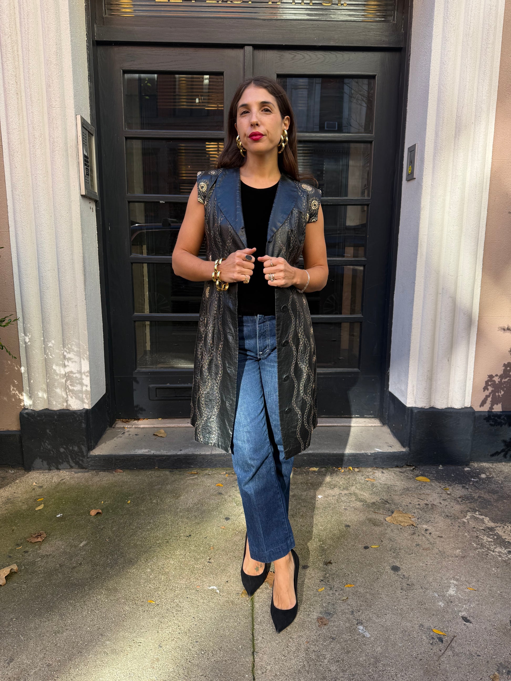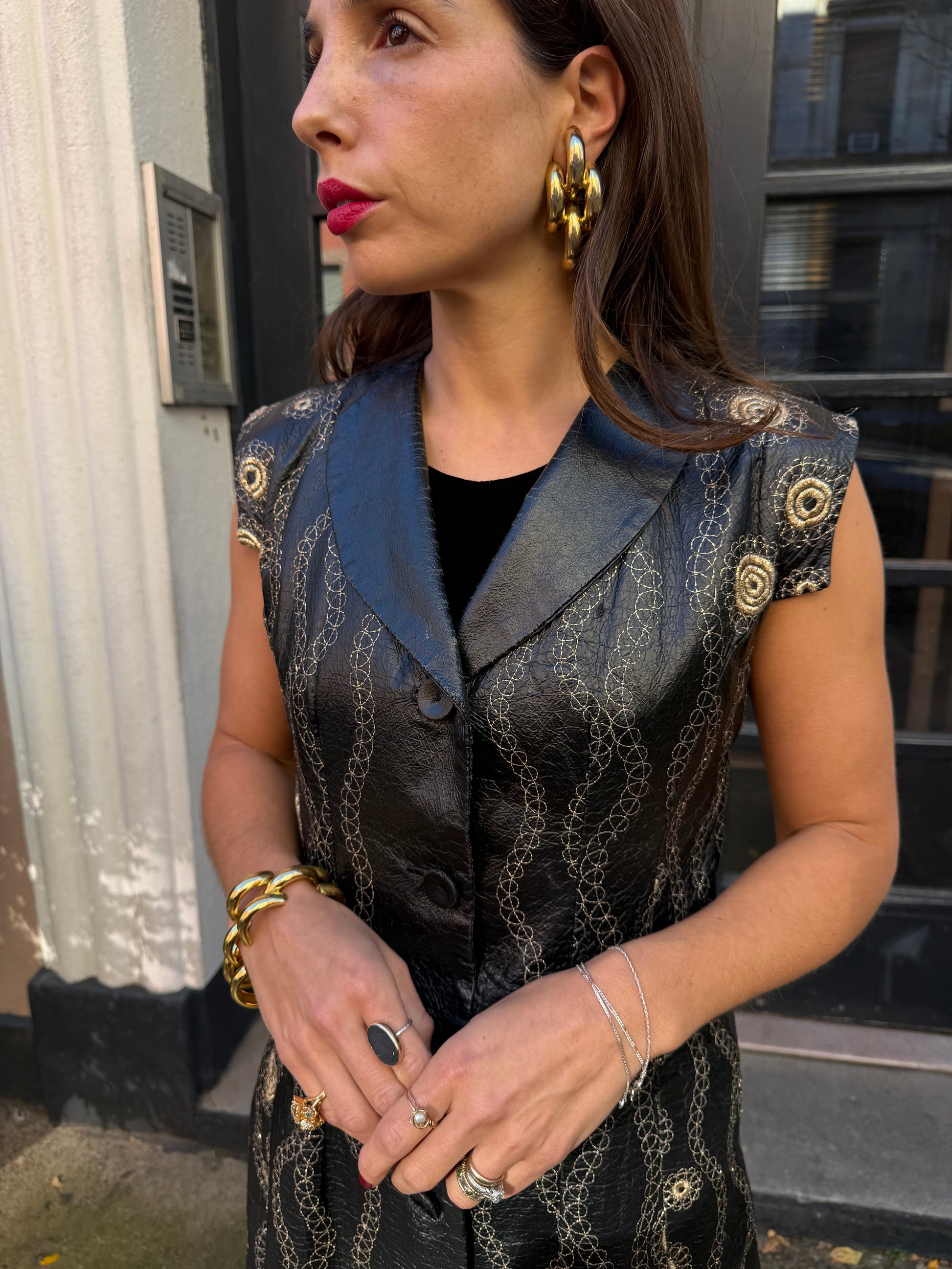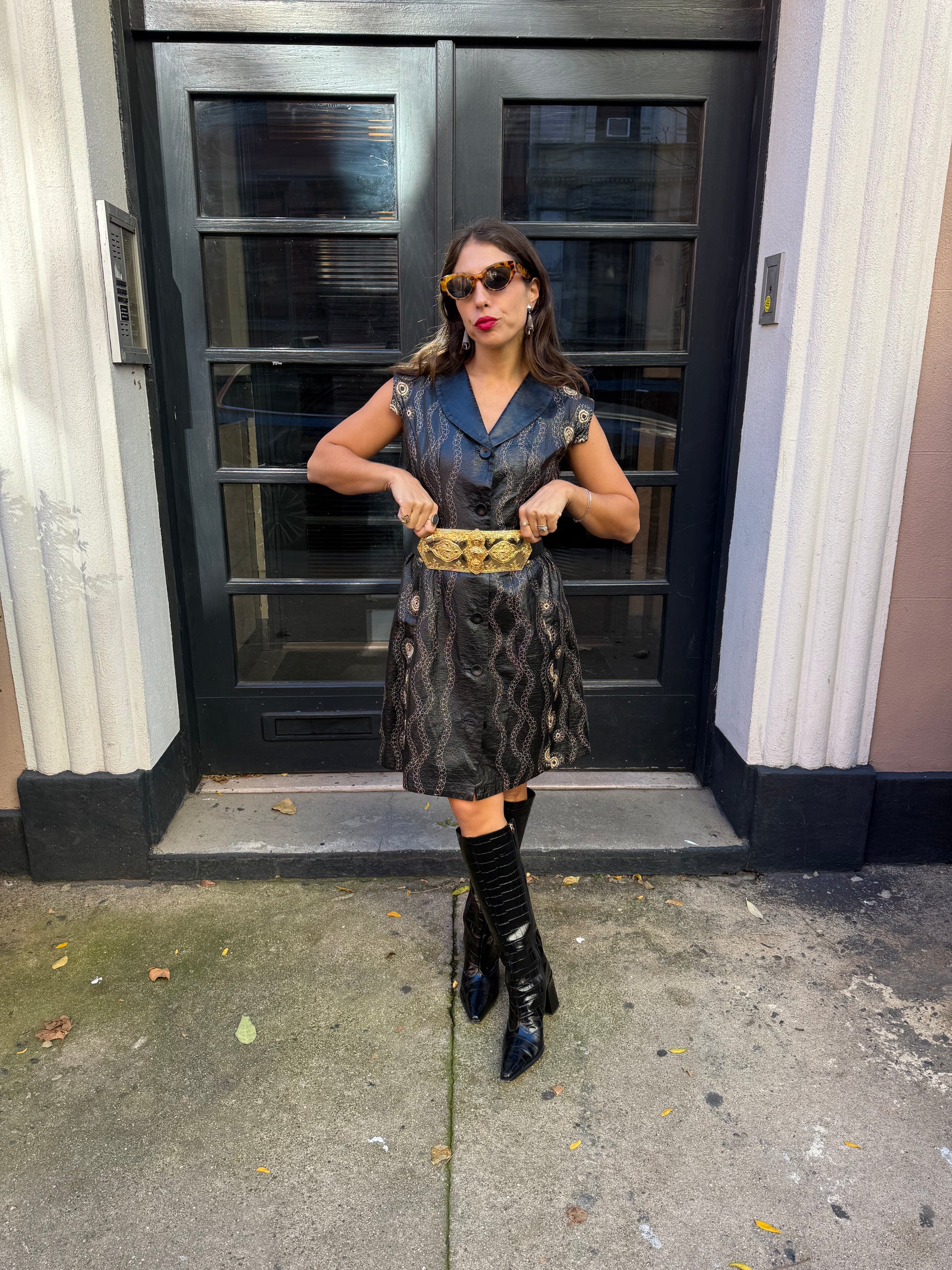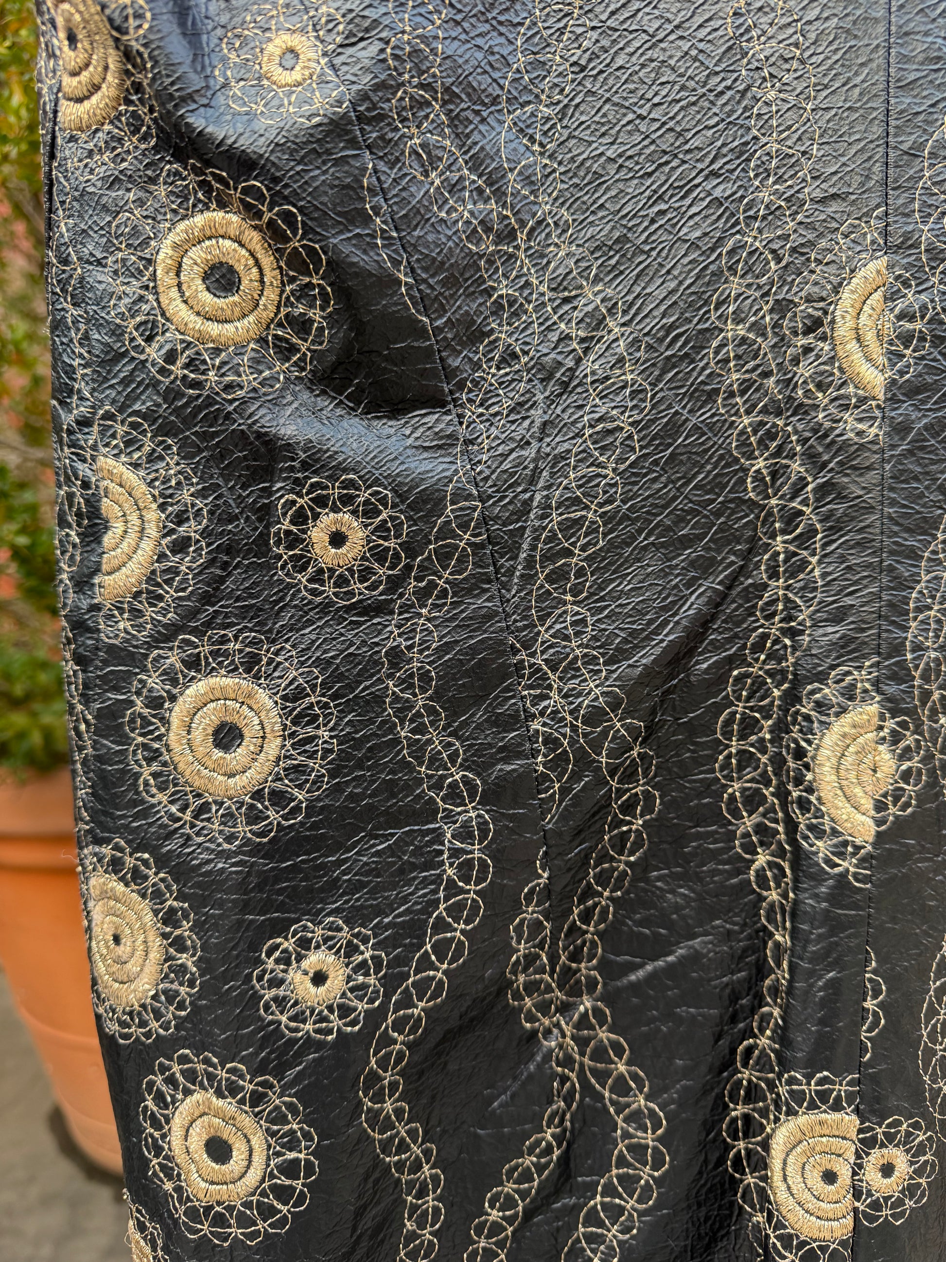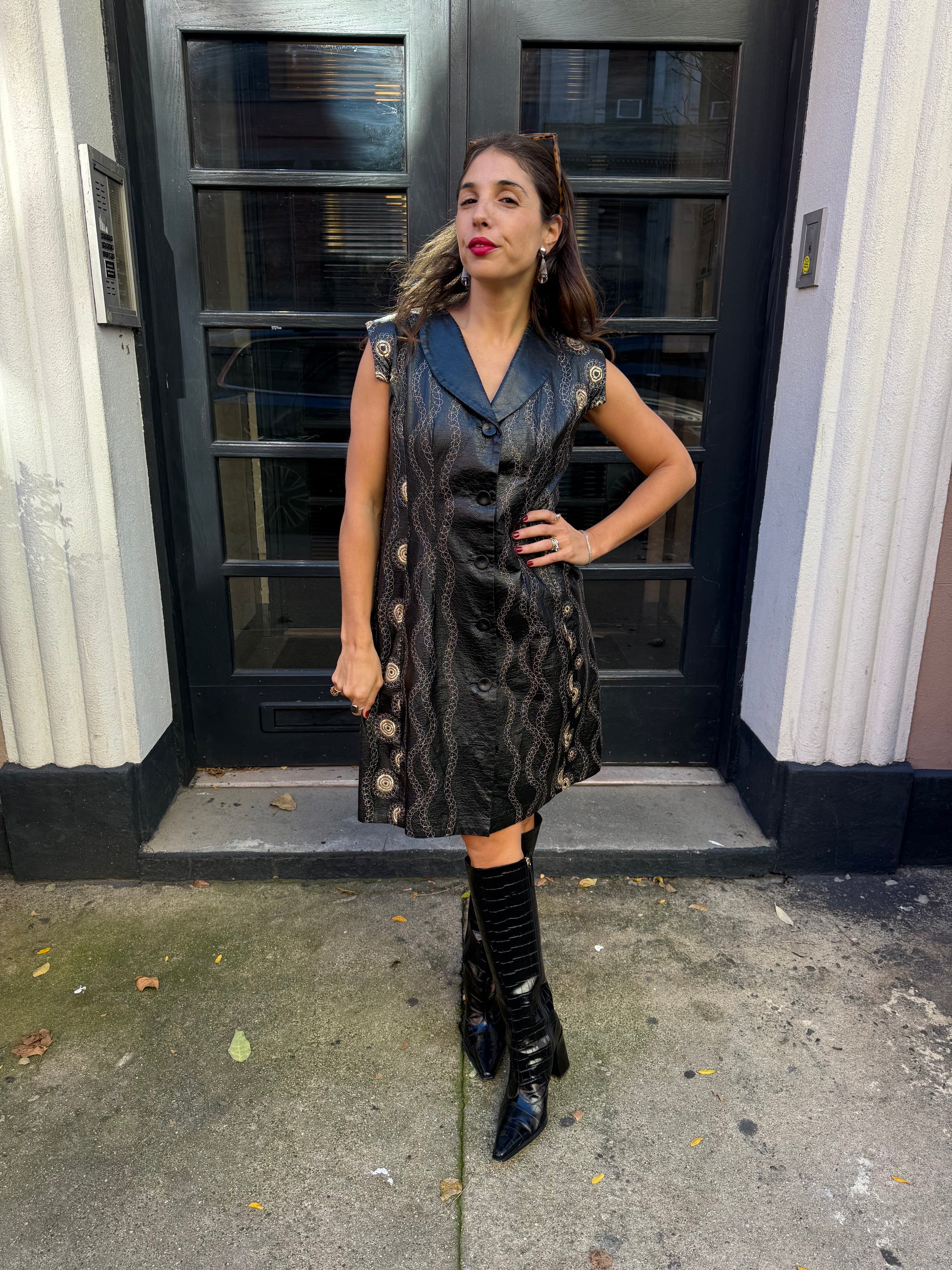 Turn heads with this striking art-to-wear vintage 60s black vest/dress, featuring intricate gold embroidery. HandCrafted from a textured vinyl, this sleeveless button-front dress combines edgy retro style with ornate embellishment, making it a standout piece for collectors and fashion lovers alike.