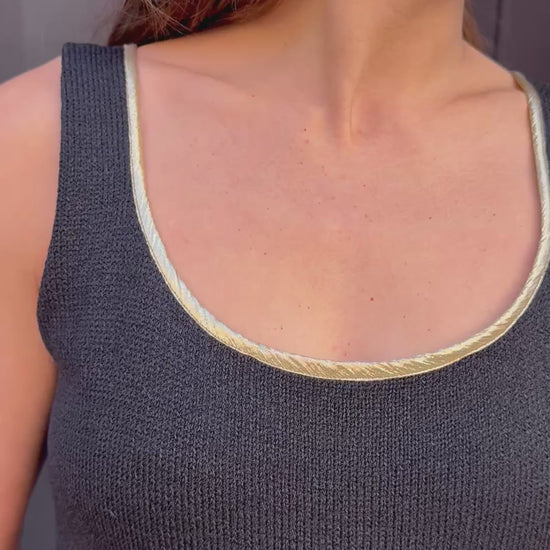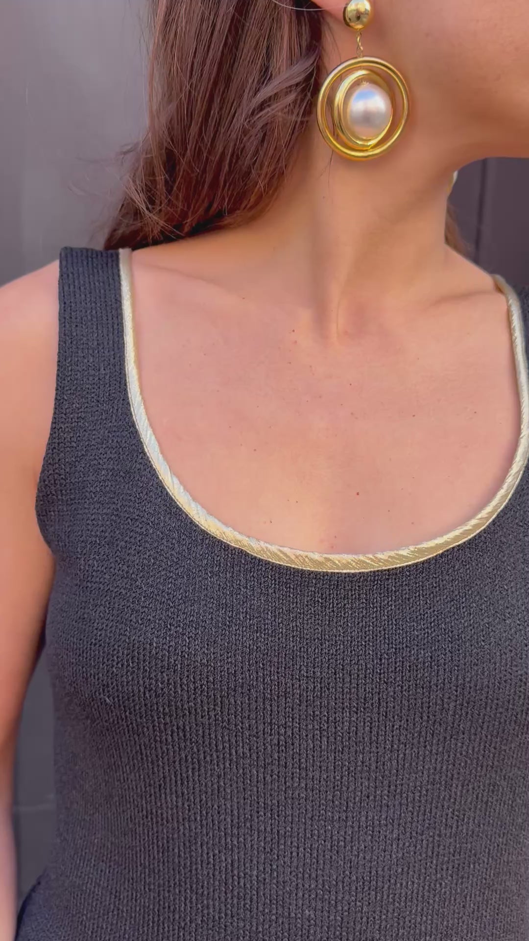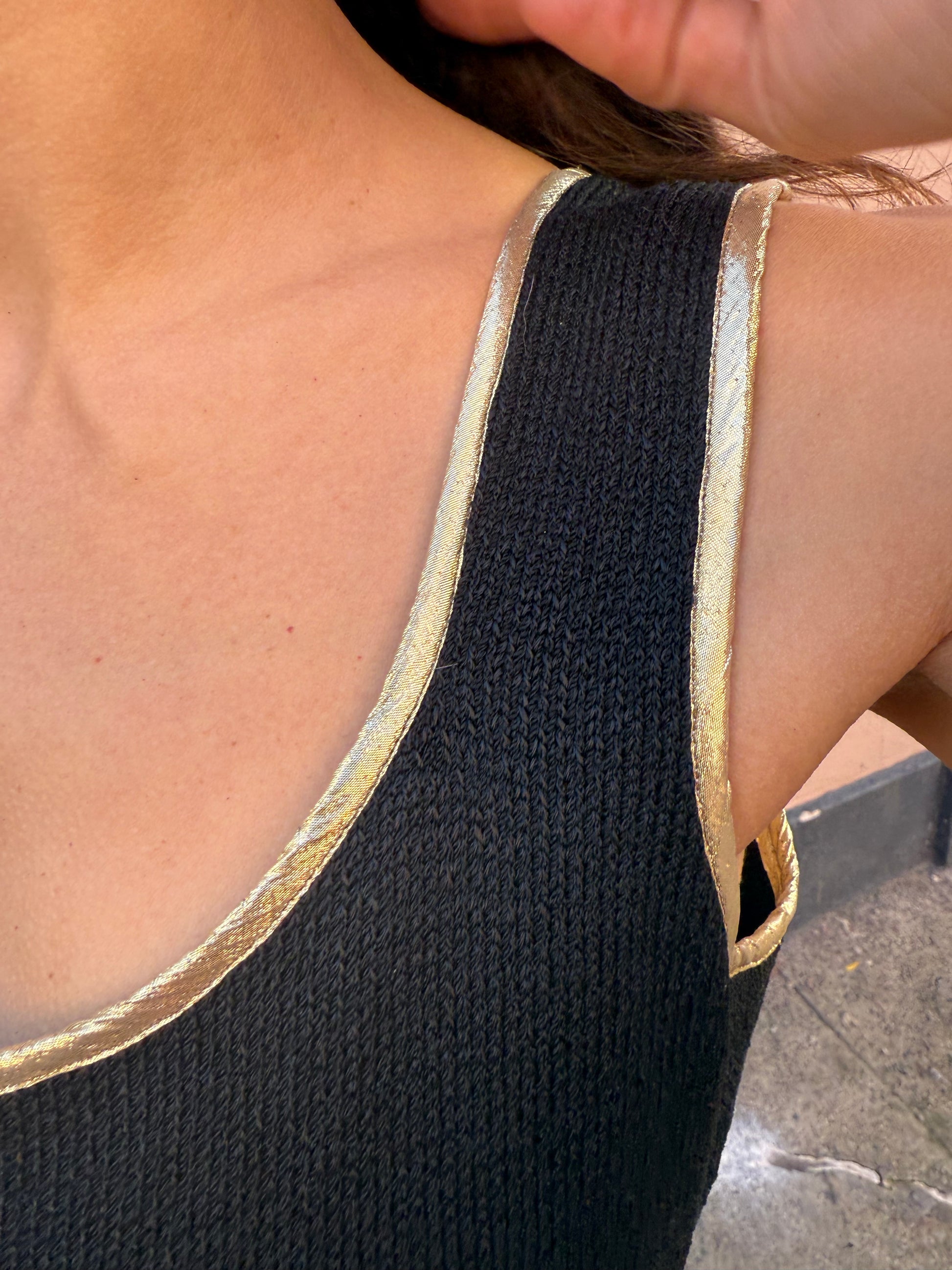 80s/90s Italian knit sleeveless dress with gold edging is an effortless classic. The scoop neckline and sleek silhouette flatter every frame, while the accessories add a pop of vintage glamour.