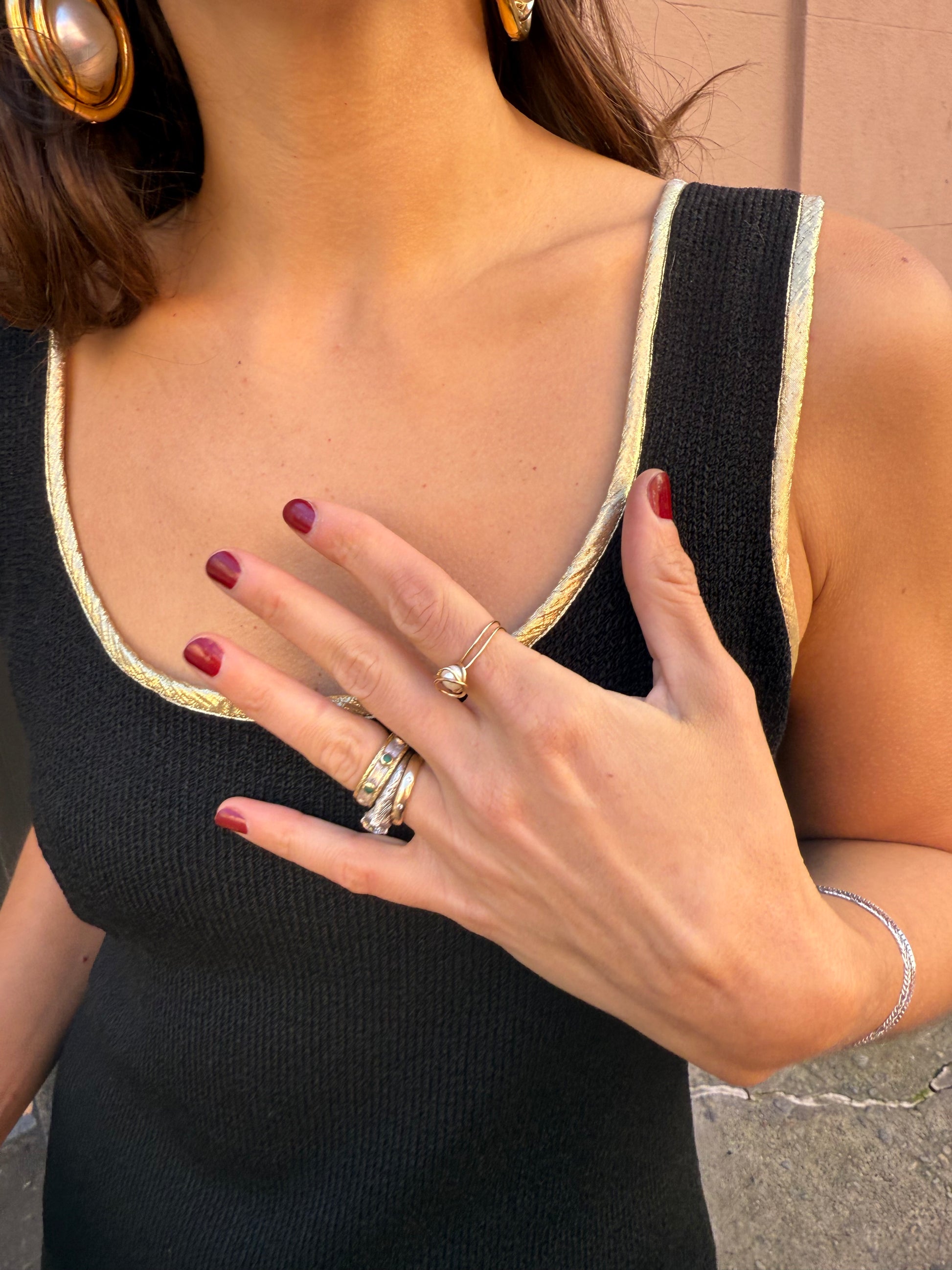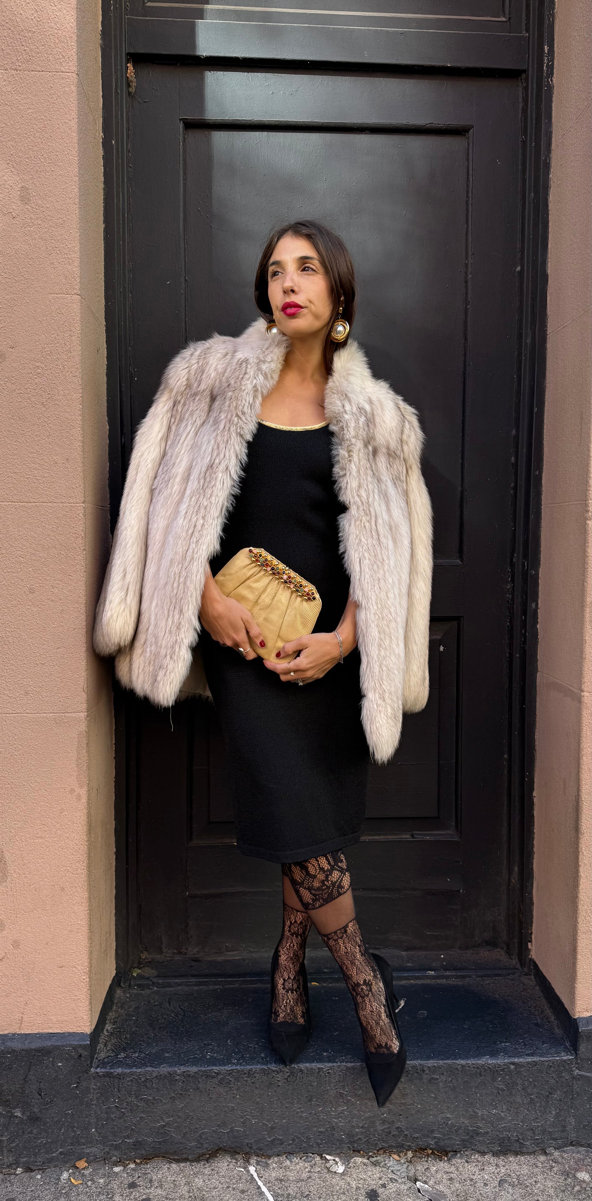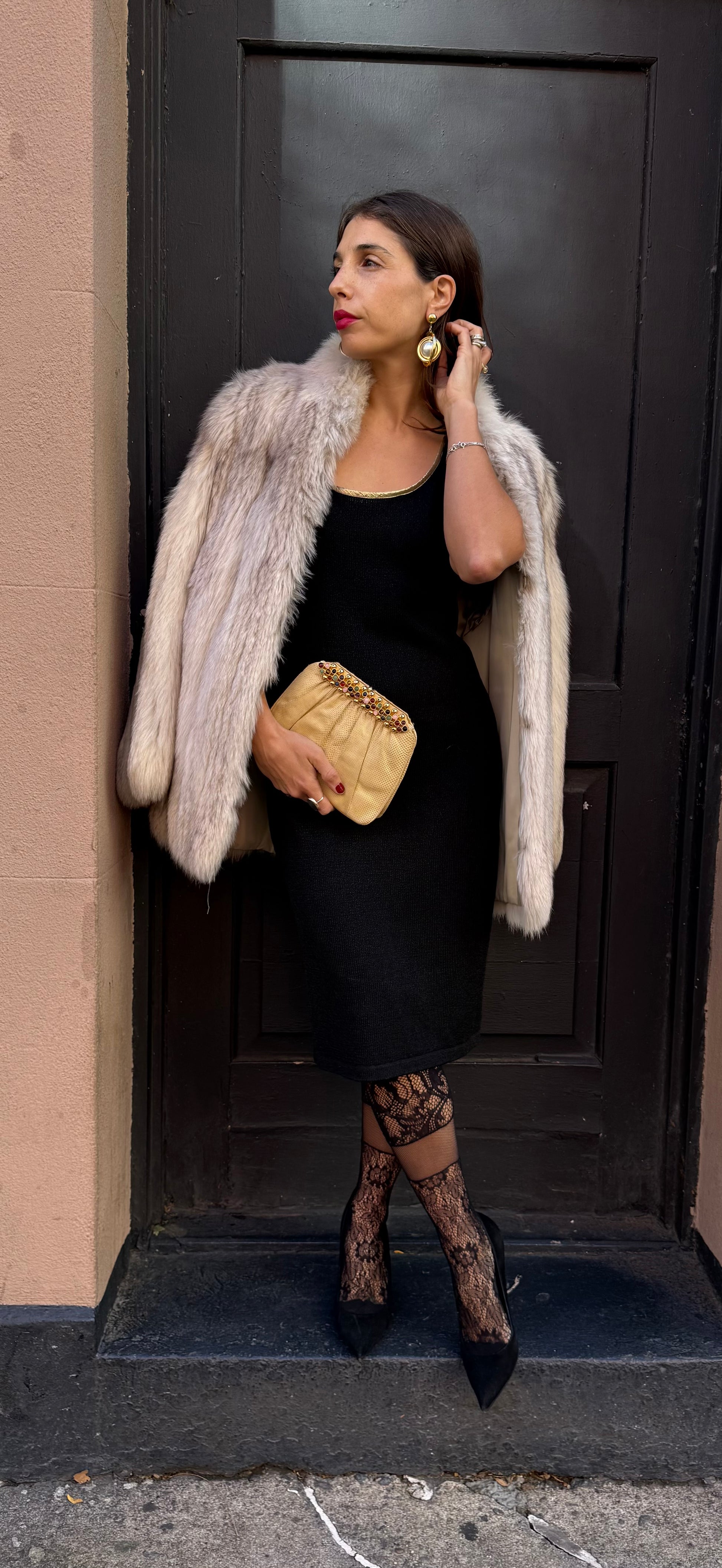 80s/90s Italian knit sleeveless dress with gold edging is an effortless classic. The scoop neckline and sleek silhouette flatter every frame, while the accessories add a pop of vintage glamour.