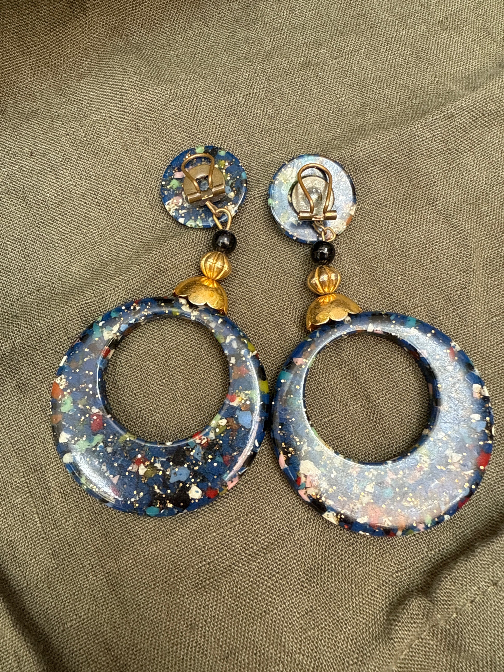 Add a burst of retro charm with these dazzling vintage confetti resin earrings from the 1960s. Featuring bold circular hoops in rich midnight blue lucite, the design is embedded with colorful flecks of red, green, white, and gold glitter, creating a striking confetti effect. The hoops dangle from matching cabochon tops accented with gold-tone beads and black spacer details, secured with classic clip-on backs.