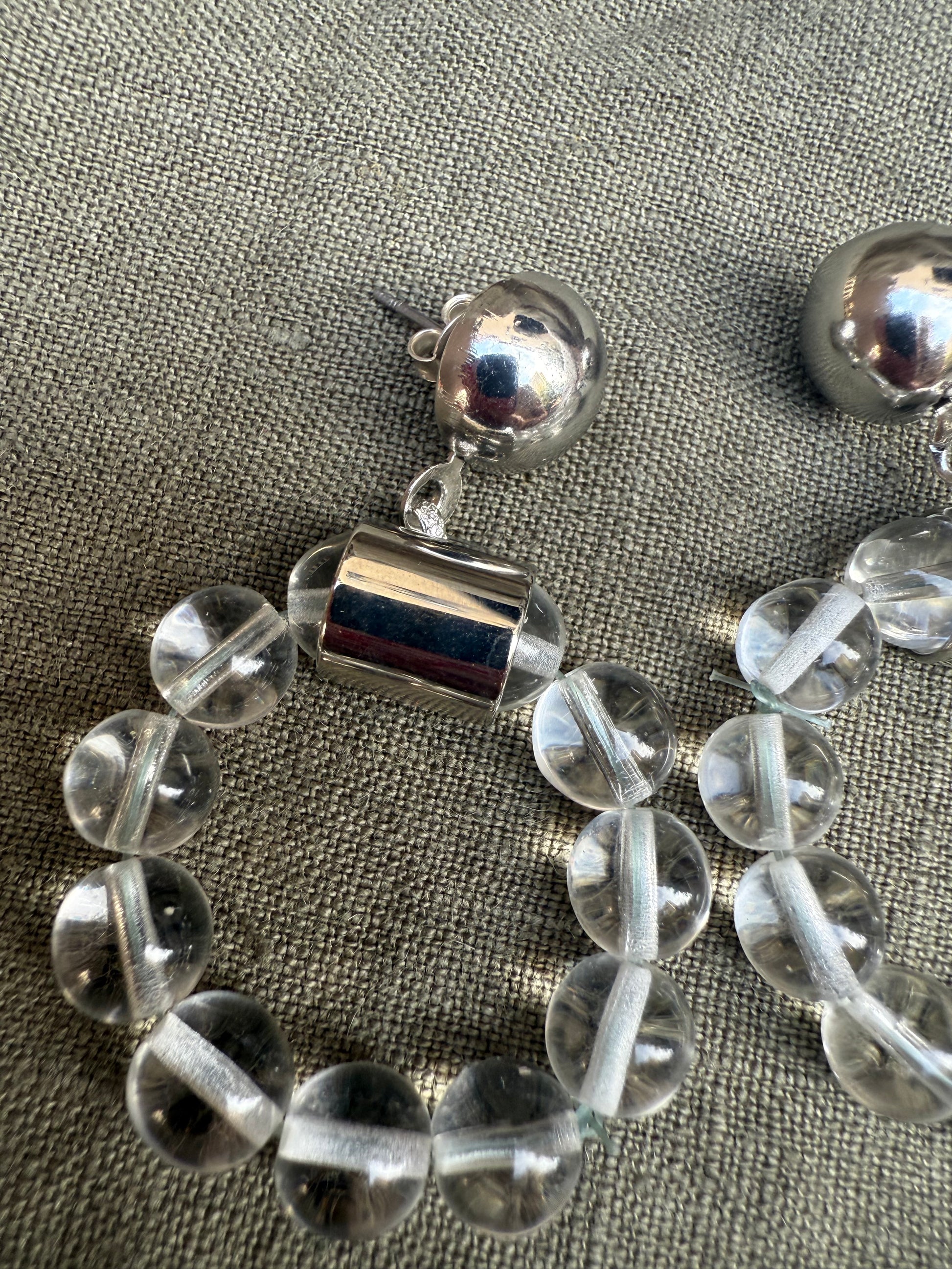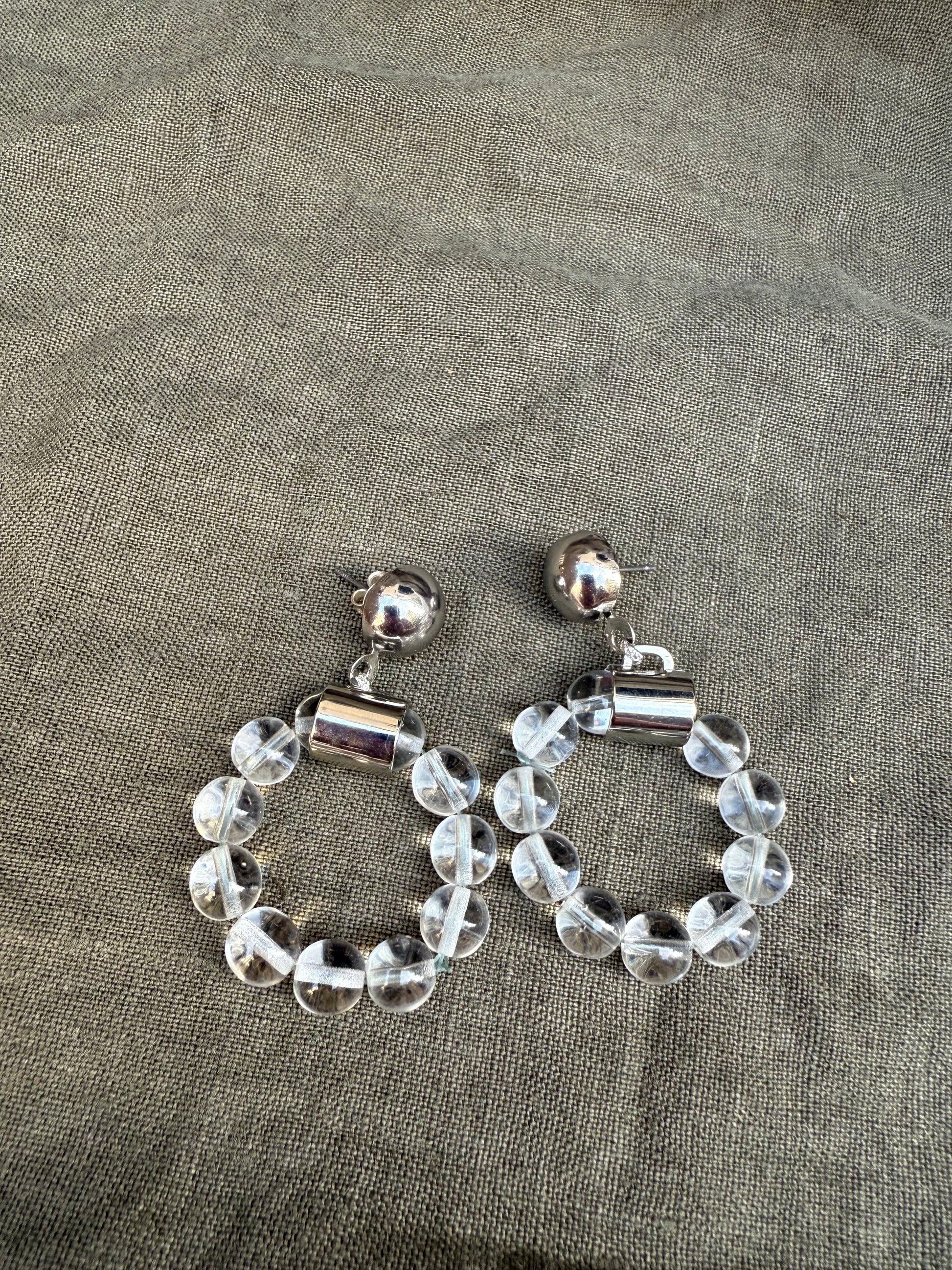 Sourced in Paris, these striking vintage earrings embody the bold, modernist style of the 1960s /1970s. Featuring clear spherical Lucite beads threaded on a silver-tone core, they catch the light beautifully with a futuristic, almost space-age appeal. Each earring is anchored by a polished silver-tone dome stud, leading into a cylindrical Lucite and metal connector that flows into the strand of perfectly rounded beads.