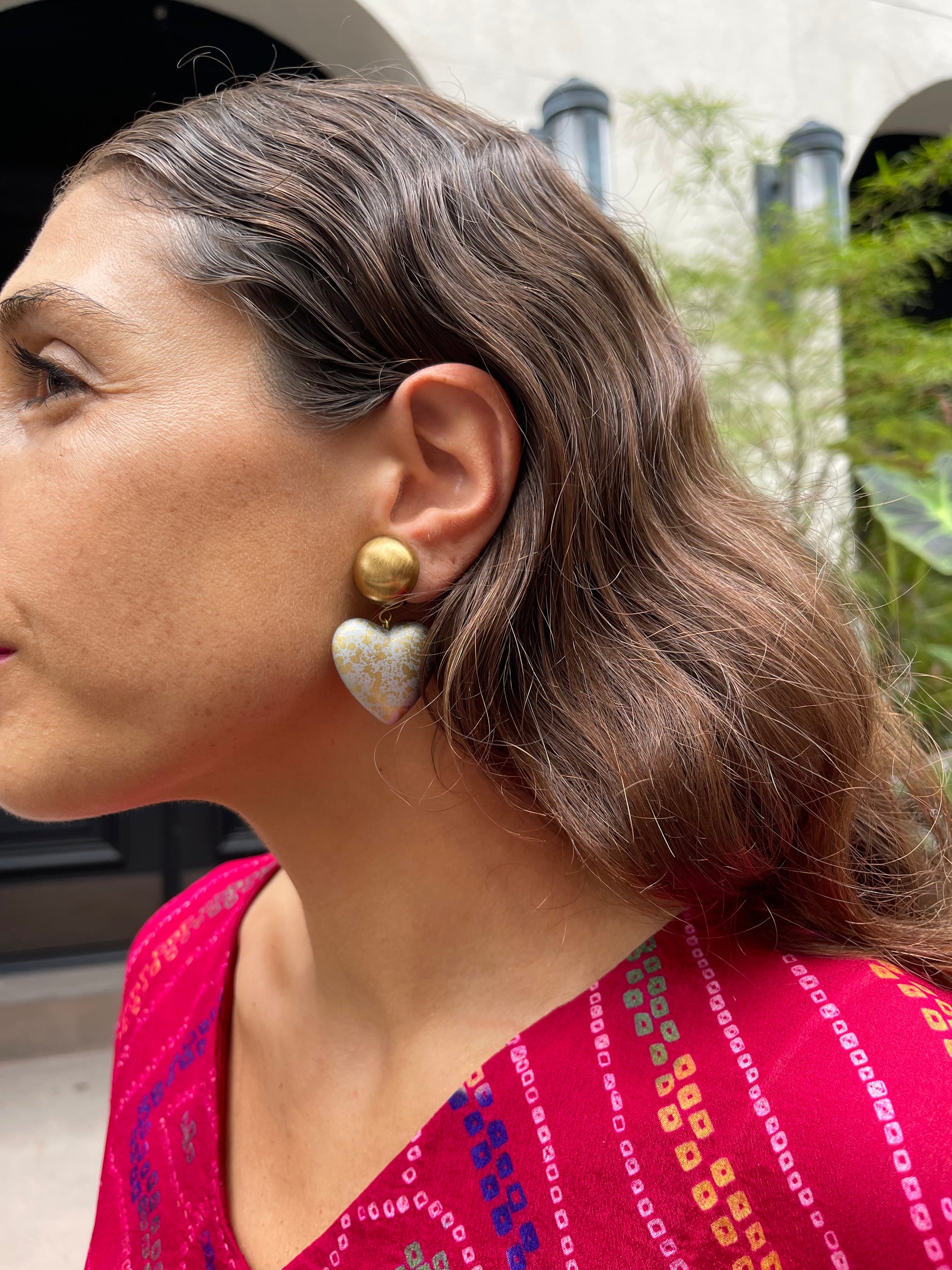 Infuse your look with timeless romance and artistic flair with these vintage puffy heart earrings. Featuring a classic matte gold stud and a dangling heart pendant, each piece is adorned with a delicate speckled gold pattern that evokes the charm of handcrafted vintage jewelry.