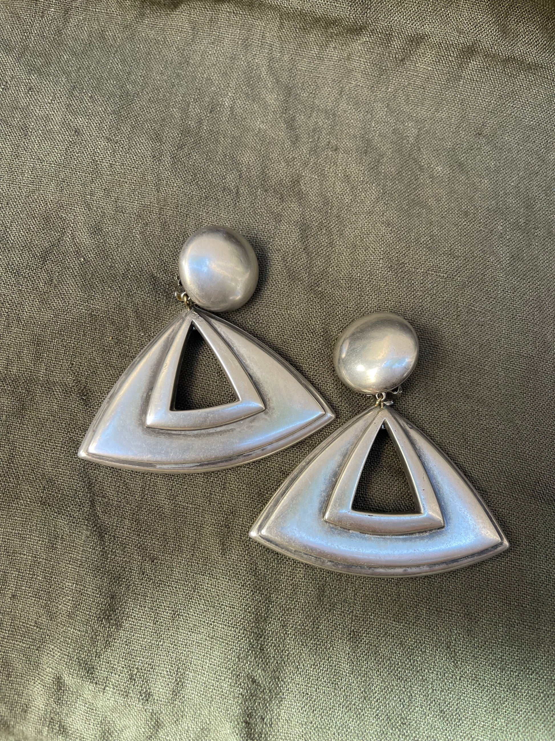 Make a striking impression with these vintage geometric earrings from TAMTAM & Amour de Bracelets, a brand rooted in the heart of Parisian fashion. Featuring a bold circular stud and a dramatic triangular drop with cut-out detailing, these modernist statement earrings blend retro sophistication with architectural edge. The metallic finish adds a sleek, sculptural quality that’s perfect for collectors of avant-garde vintage jewelry.