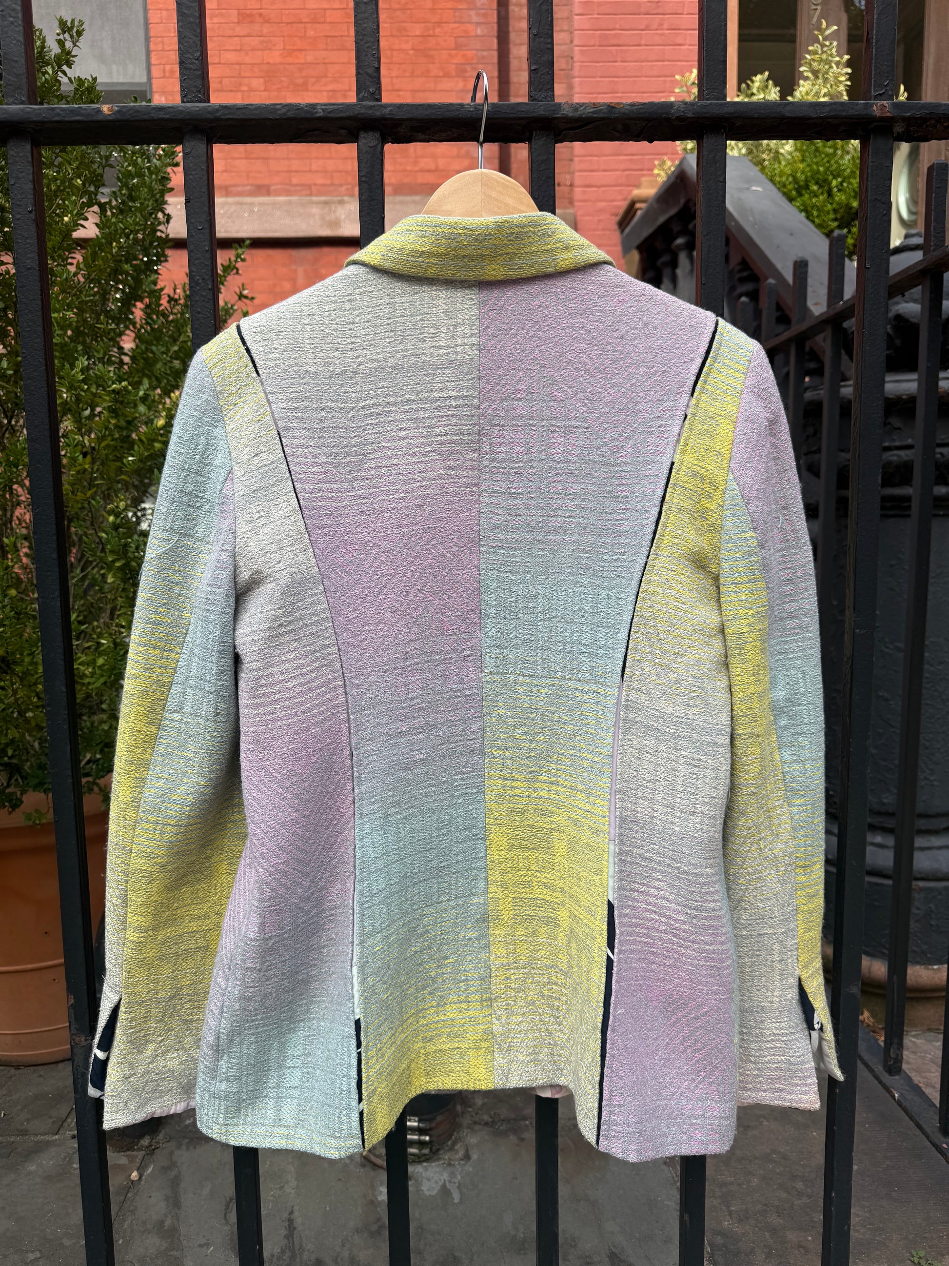 A vibrant vintage statement blazer from BAZAR, sourced in Paris. Crafted in a textured woven fabric with a painterly pastel palette of mint, lavender, yellow, and soft grey, this piece captures a playful yet sophisticated mood.
