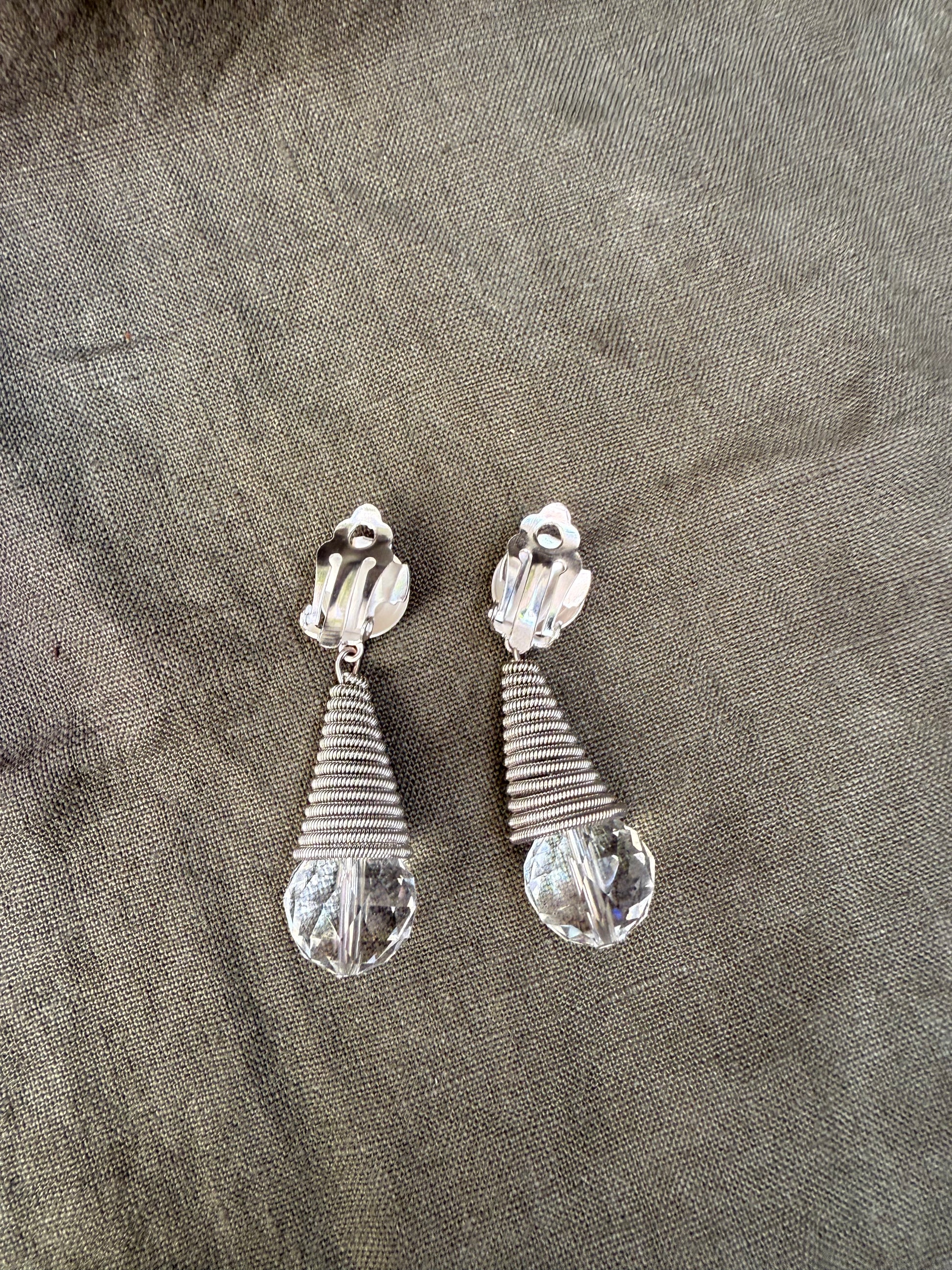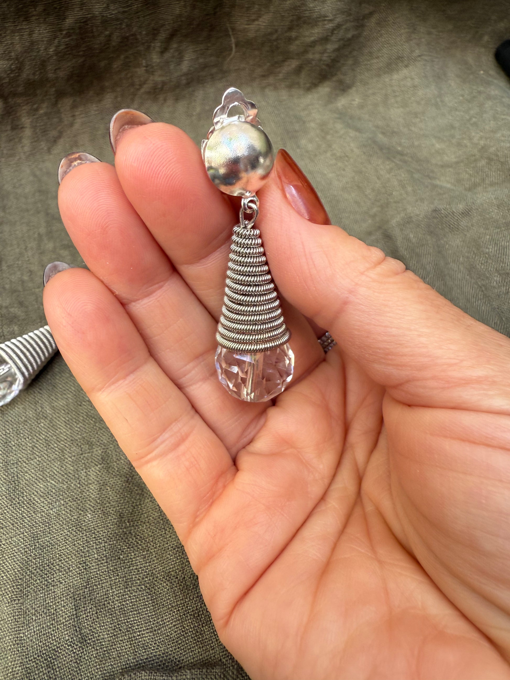 Elevate your accessory game with these vintage wire-wrapped crystal drop earrings, a stunning fusion of mid-century elegance and artisanal craftsmanship. Each earring features a bold, irregular metallic stud that anchors a conical coil of antique-finish wire, culminating in a faceted teardrop crystal that catches the light with every movement.