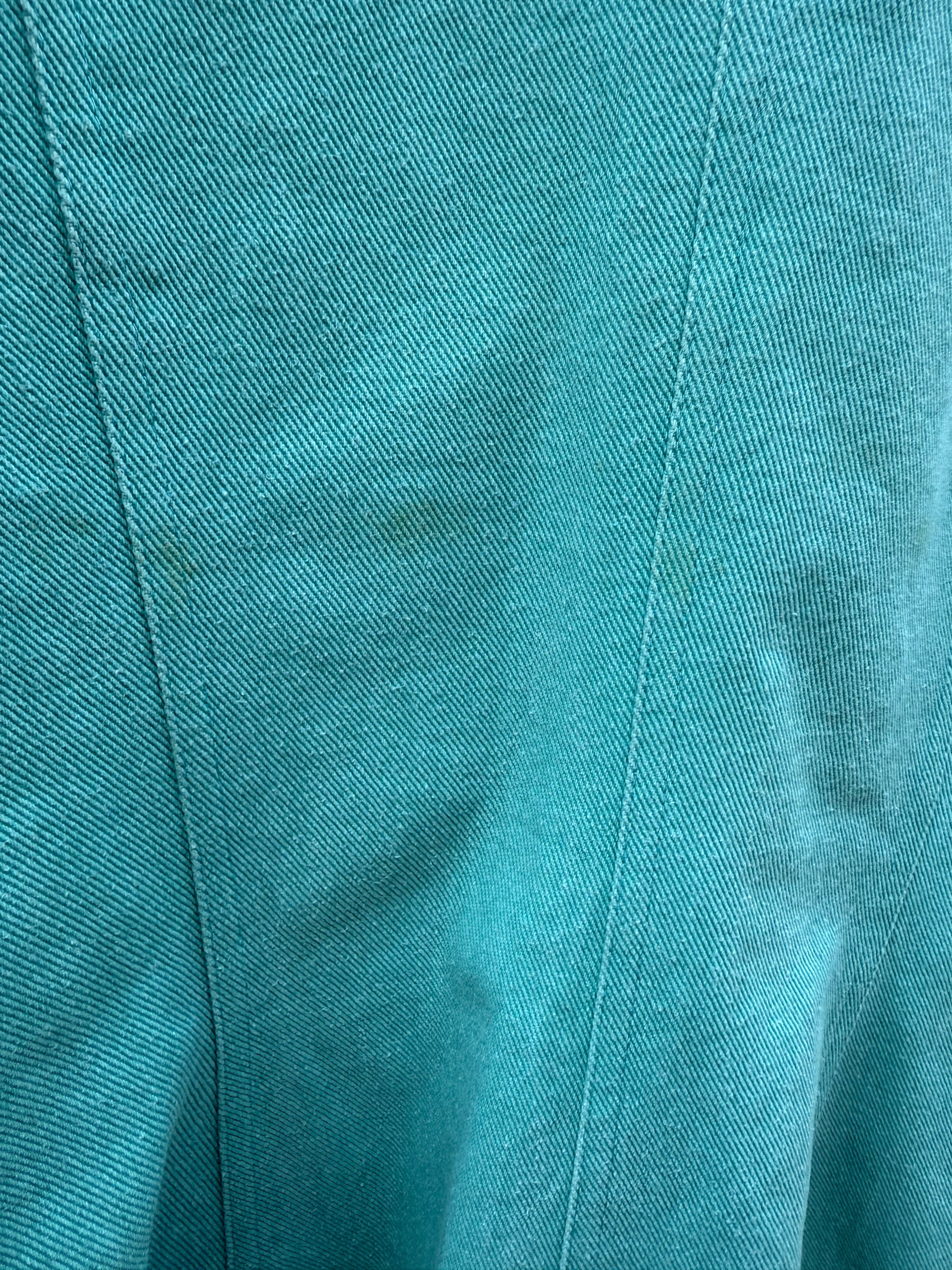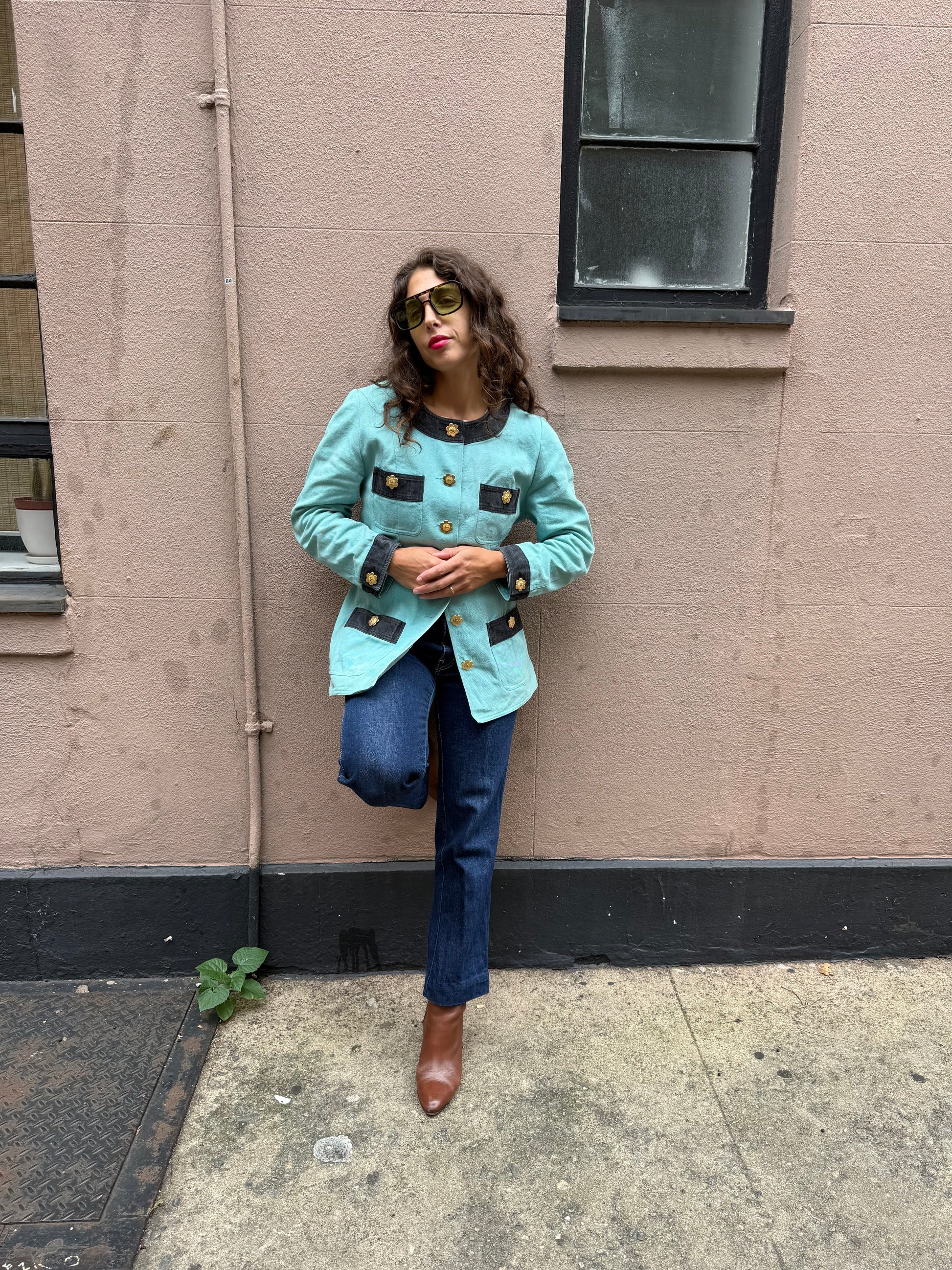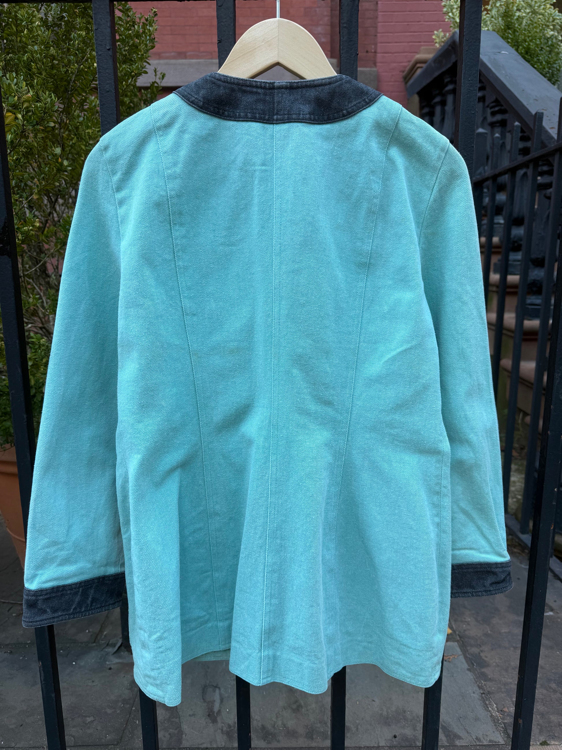 90s Maud Defossez turquoise denim jacket gold flower buttons
